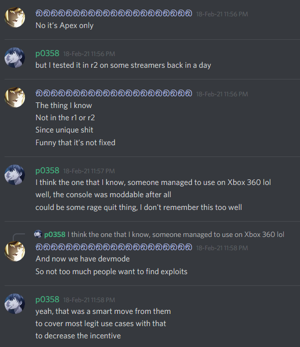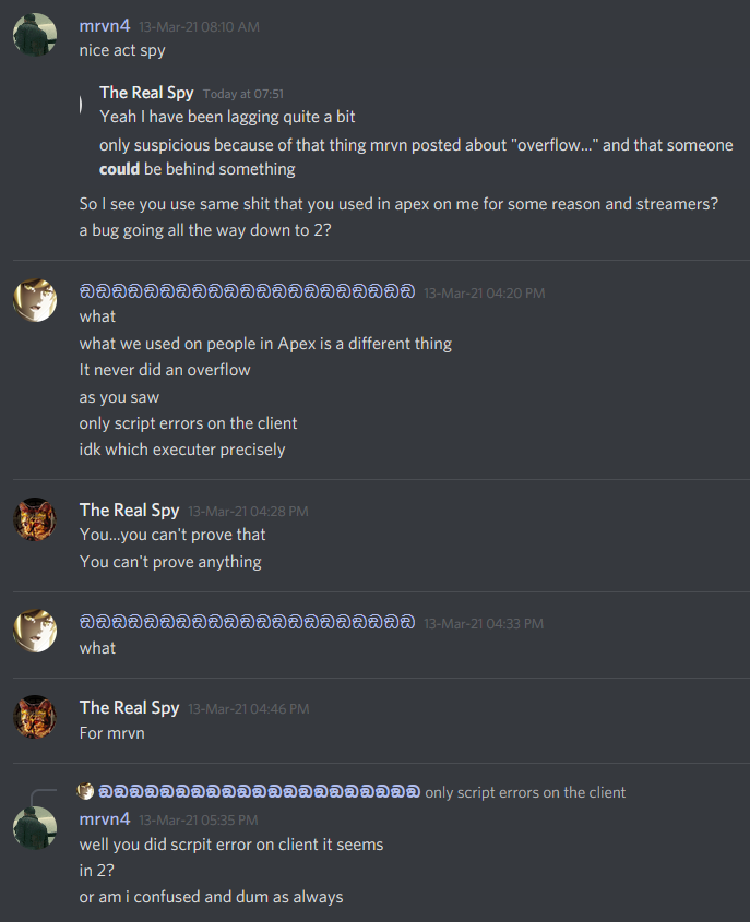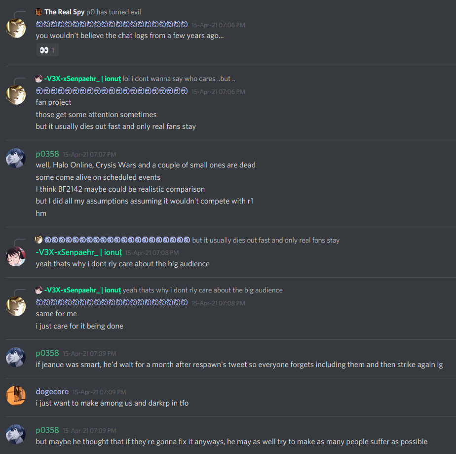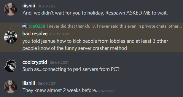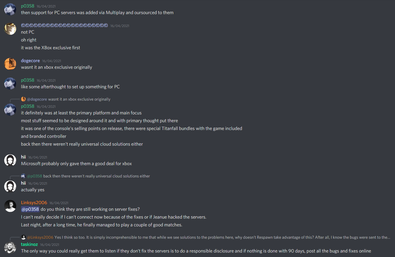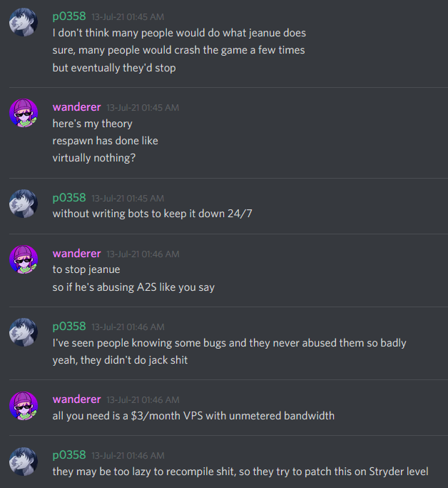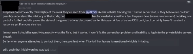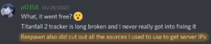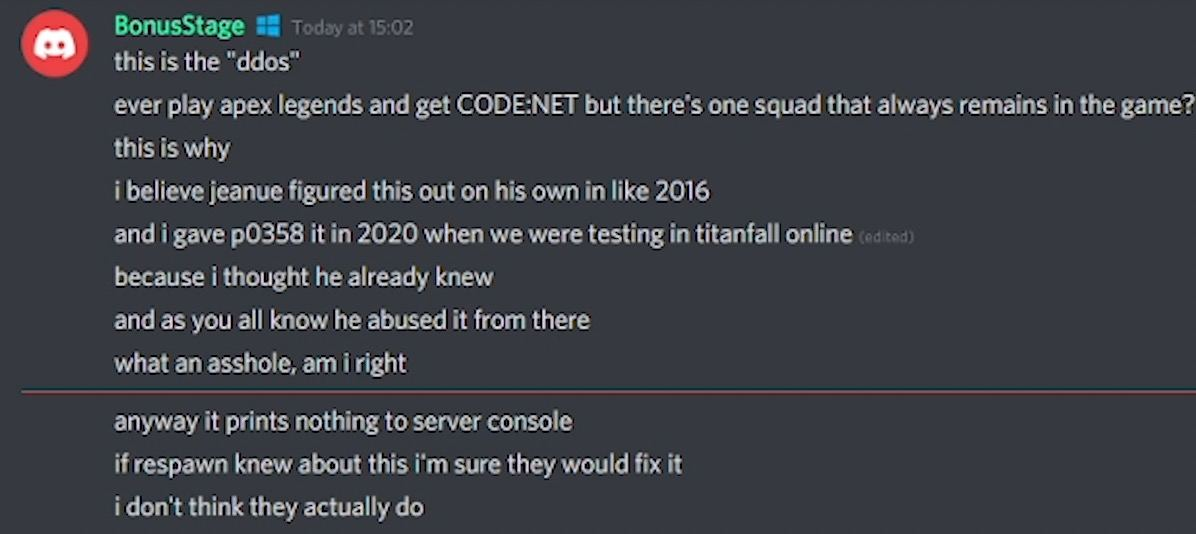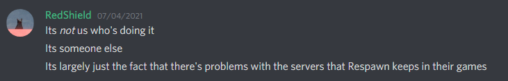 In later 2020 we found out that he's using some ways to lag the servers and make them appear as if they were completely dead and unconnectable despite responding normally to queries. We later learned that this is what we recognize now as "DoS". I recognized the shape of this attack once we managed to go into actual match and encountered the characteristic symptoms. Interestingly, after the game got released on Steam, Jeanue stopped the attacks for around two weeks. After that period of time, he completely annihilated it again. There were some rare short periods of time where they'd go down and the game would work for a couple of hours. However, in their eventual attempts to fix the situation, Respawn only broke more things while not slowing the attacks down even a tiny bit, instead of fixing the root cause of the exploits.