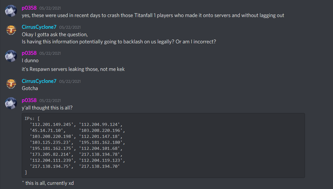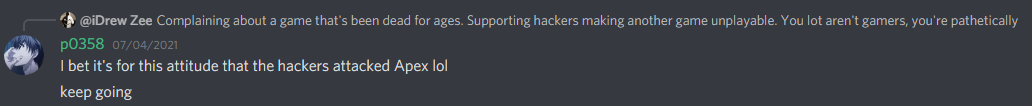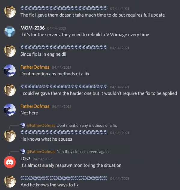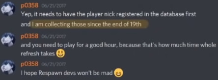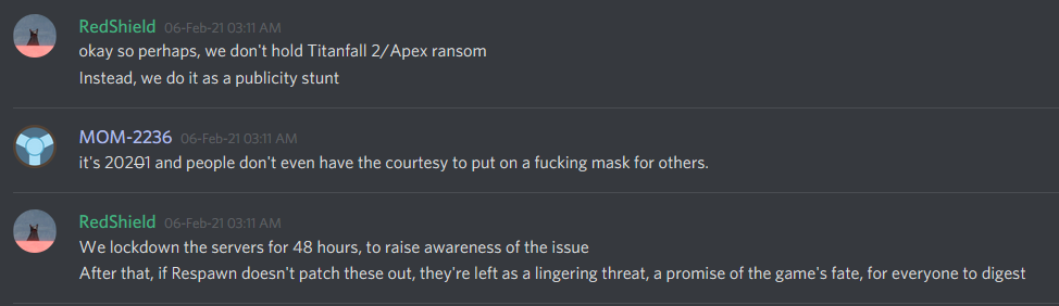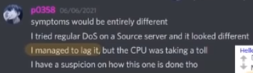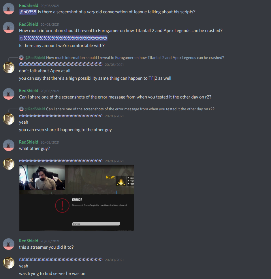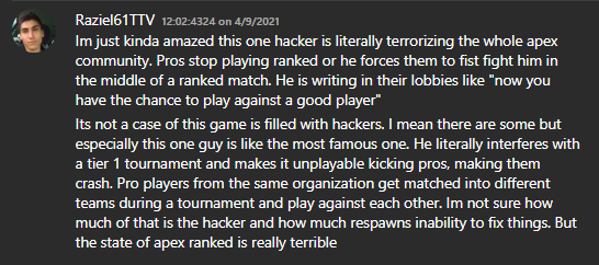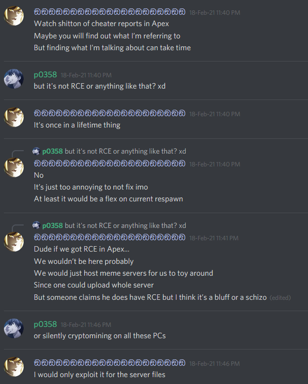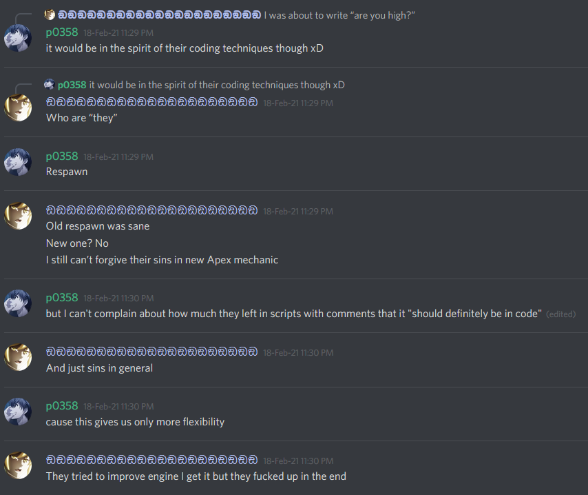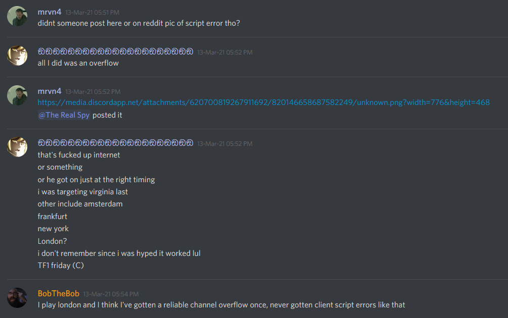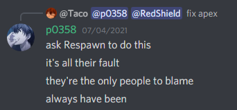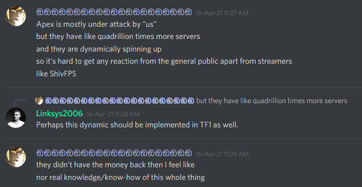 In later 2020 we found out that he's using some ways to lag the servers and make them appear as if they were completely dead and unconnectable despite responding normally to queries. We later learned that this is what we recognize now as "DoS". I recognized the shape of this attack once we managed to go into actual match and encountered the characteristic symptoms. Interestingly, after the game got released on Steam, Jeanue stopped the attacks for around two weeks. After that period of time, he completely annihilated it again. There were some rare short periods of time where they'd go down and the game would work for a couple of hours. However, in their eventual attempts to fix the situation, Respawn only broke more things while not slowing the attacks down even a tiny bit, instead of fixing the root cause of the exploits.