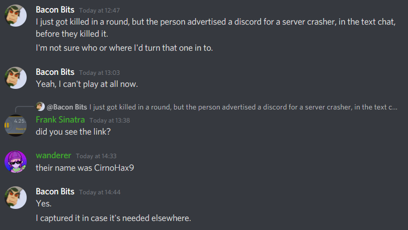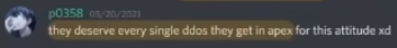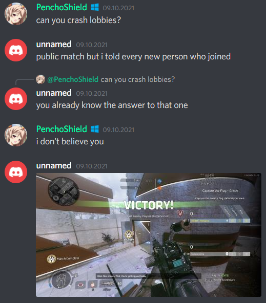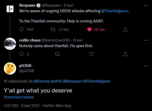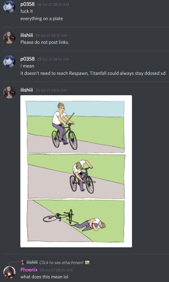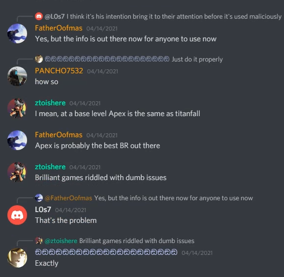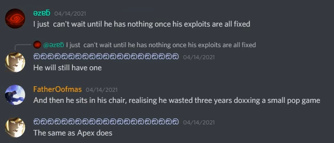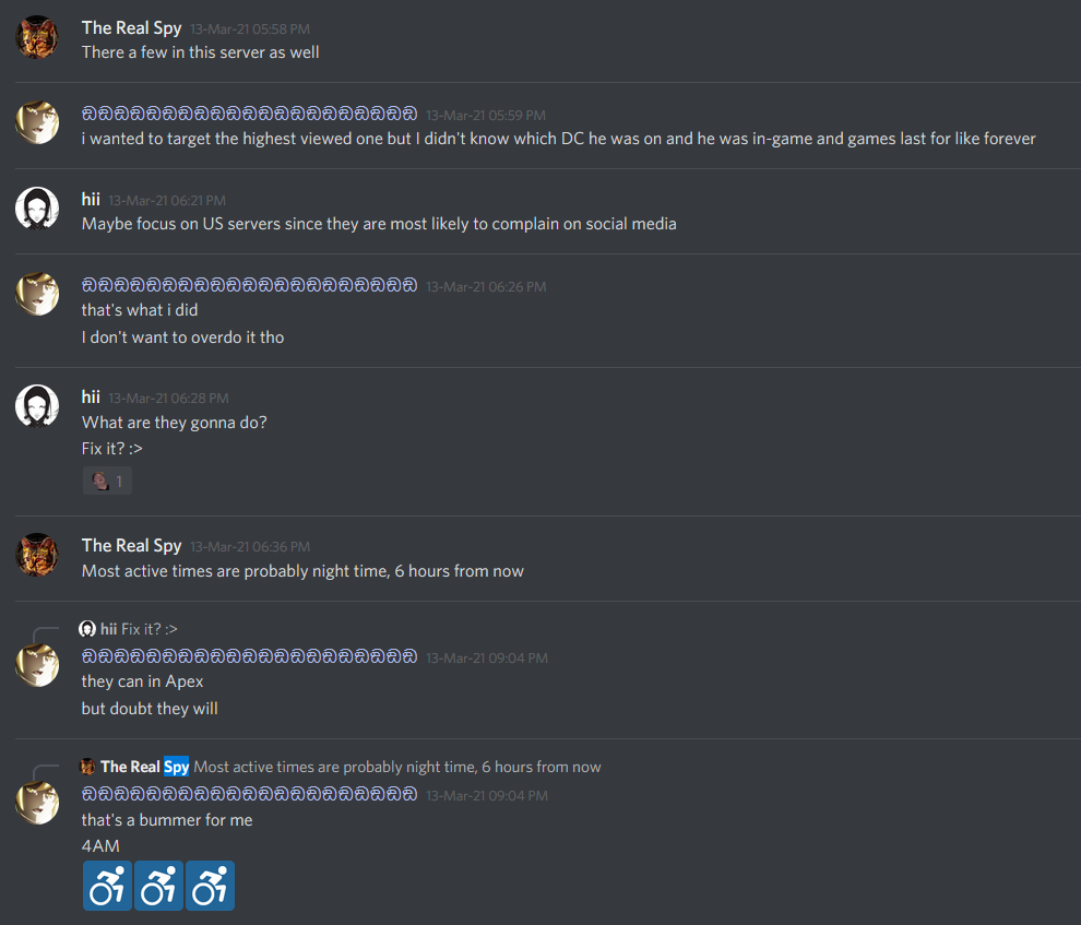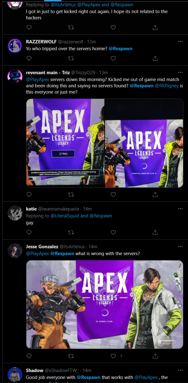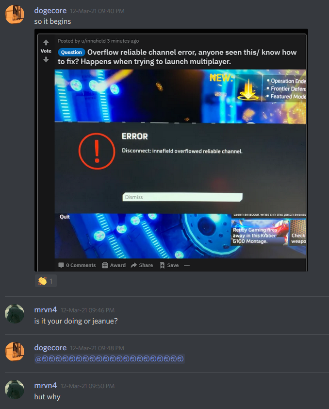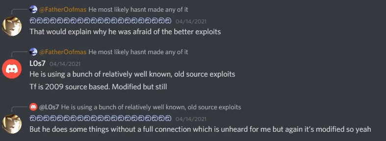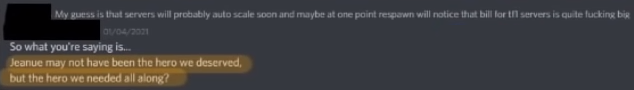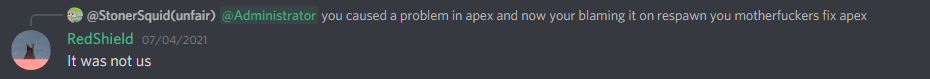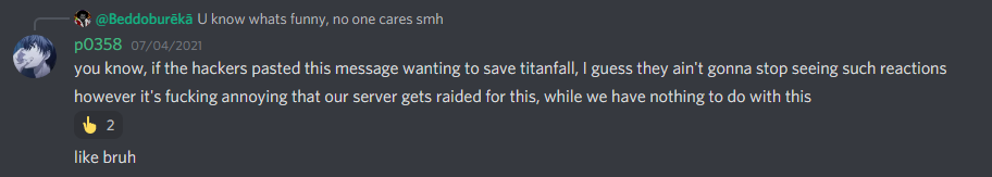 In later 2020 we found out that he's using some ways to lag the servers and make them appear as if they were completely dead and unconnectable despite responding normally to queries. We later learned that this is what we recognize now as "DoS". I recognized the shape of this attack once we managed to go into actual match and encountered the characteristic symptoms. Interestingly, after the game got released on Steam, Jeanue stopped the attacks for around two weeks. After that period of time, he completely annihilated it again. There were some rare short periods of time where they'd go down and the game would work for a couple of hours. However, in their eventual attempts to fix the situation, Respawn only broke more things while not slowing the attacks down even a tiny bit, instead of fixing the root cause of the exploits.