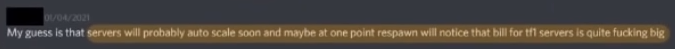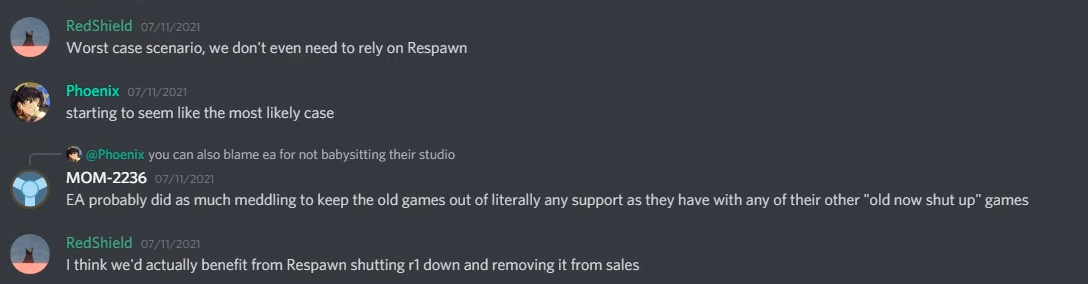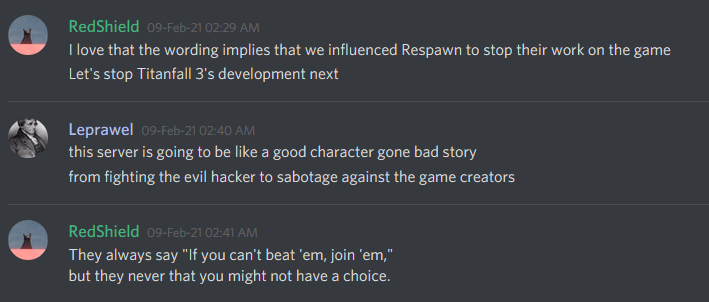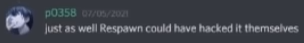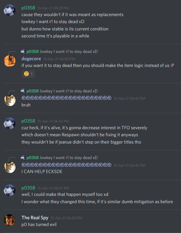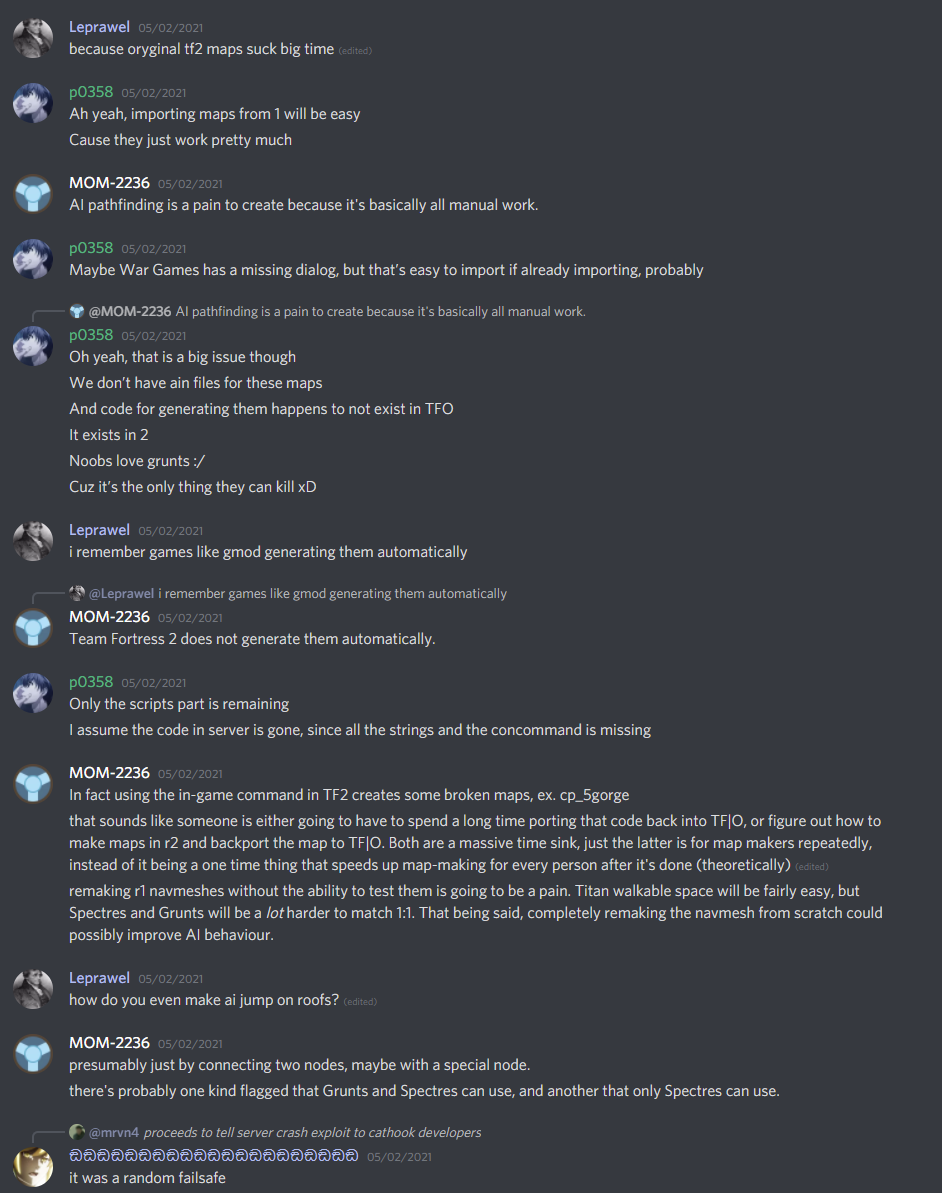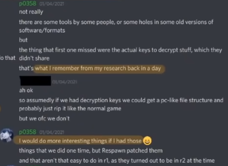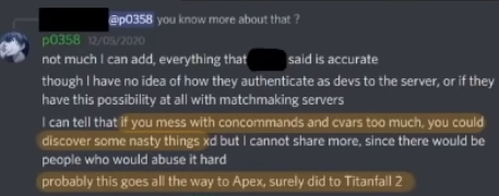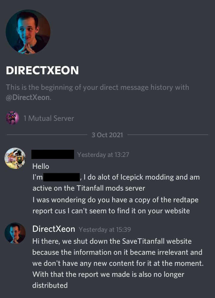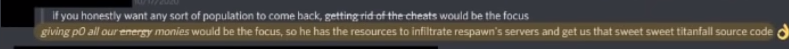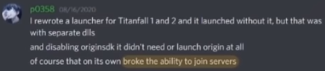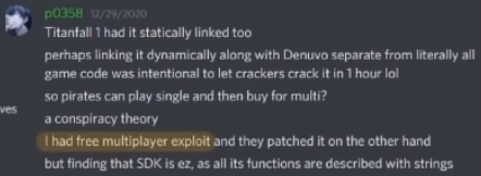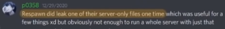 It seemed immediately obvious to me how far-fetched the accusations in UE/Redtape’s contents are, especially in the PDF file — screenshots cut crucial contextualization that makes or breaks the argument. I assume this is for the sake of brevity, yet they have tons of screenshots that don’t really serve any purpose. RedShield is a young man, why are you trying to make him look bad for hoping he can get a job at Respawn? Even in chat threads about this topic I’ve seen people that are outside of the situation recognizing this (MoDen says his BS detectors are going off). Frankly, their argument is poorly constructed. One of the limiting factors in creating private servers for Respawn games is that clients did not ship with a server.dll file, which contains essential code for running a server. For years people have brought up the idea of private servers without Jeanue; however, the answer was simply “we don’t have a server.dll, nothing we can do.” p0 et al initially believed it’d be too involved to create one that works for r1. Despite this huge technical hurdle (big maybe) for a low pop game, the group behind SaveTitanfall allege that: