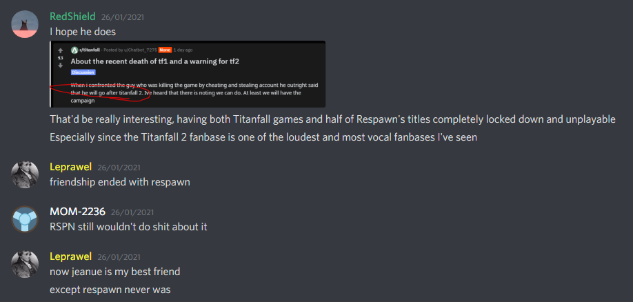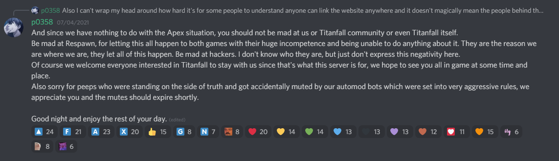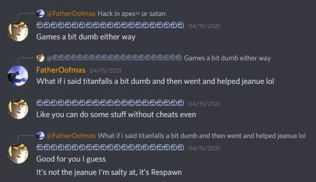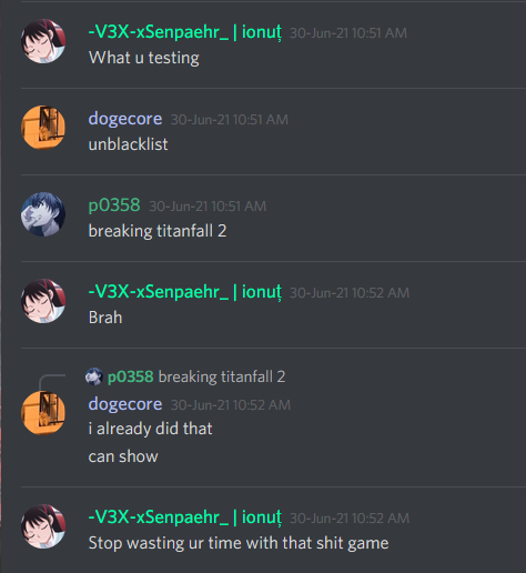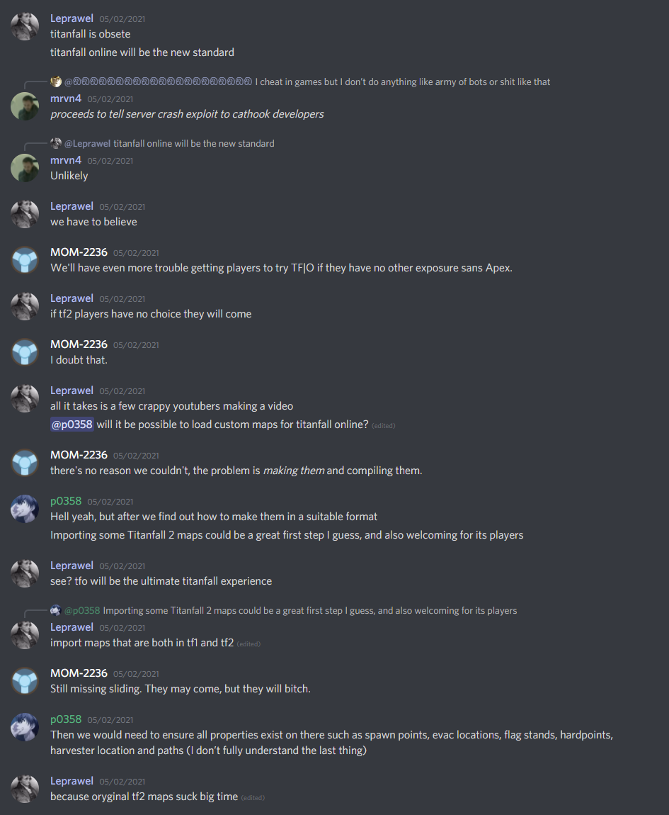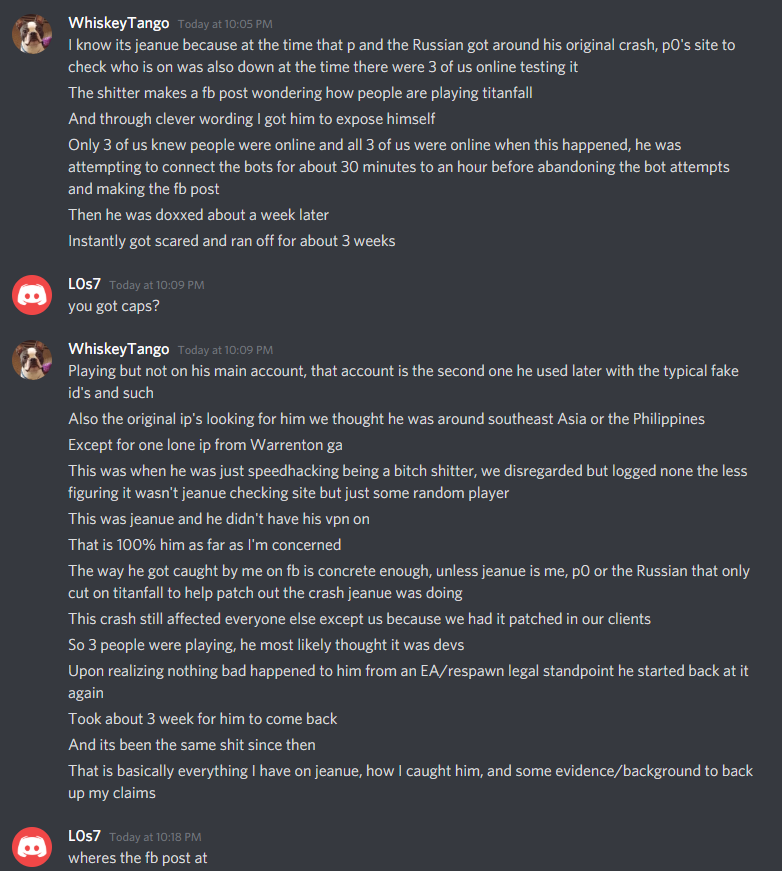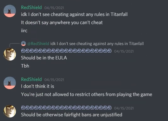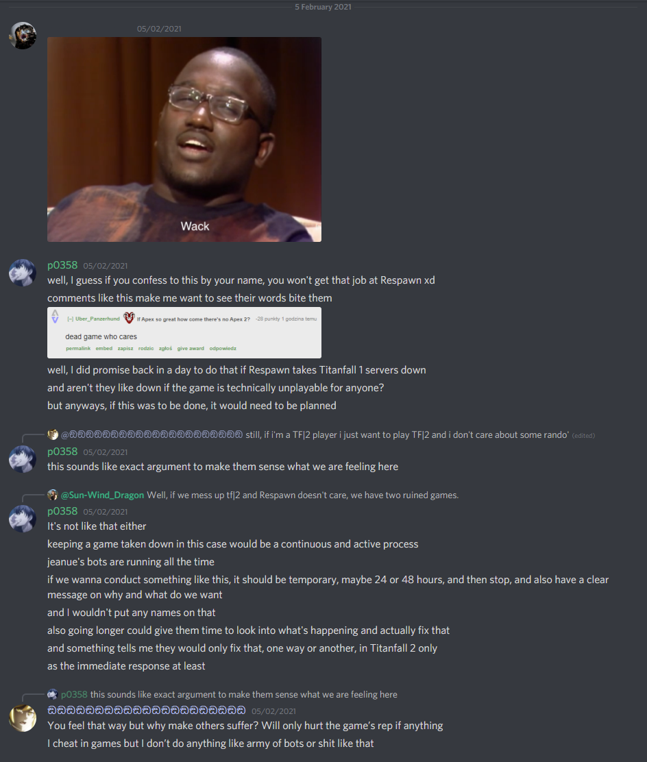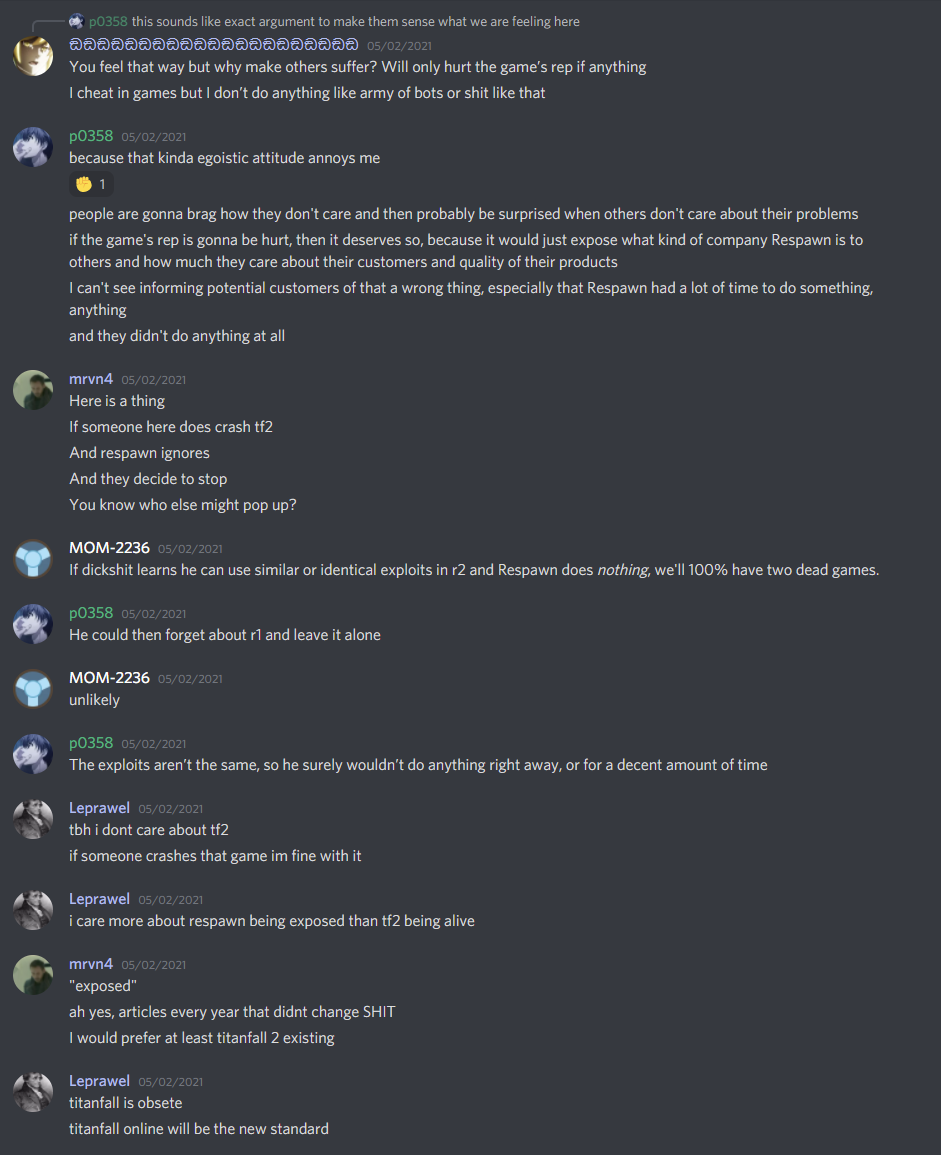 p0358: If you cared to look around at all, the conversation at that point was about one of the cheaters who was proud of his acts enough to brag about his cheating on a YouTube channel with his real name and to also share those videos later on his Facebook account. And I never hid the fact that I used to mess with some cheaters in-game back in 2018, to stop them from messing up the game for others and making regular players quit, and maintained a list of known cheaters along with their usernames, user IDs and links to the evidence of cheating. A questionable act, perhaps, but I did this because I didn't want Titanfall 1 to die. And its population did start to decline rapidly due to the rise of those cheaters, when there was nowhere else to go to avoid them.