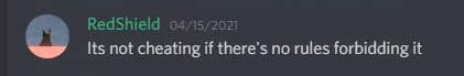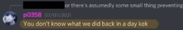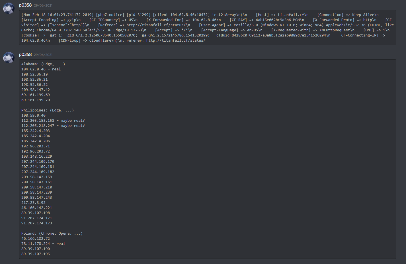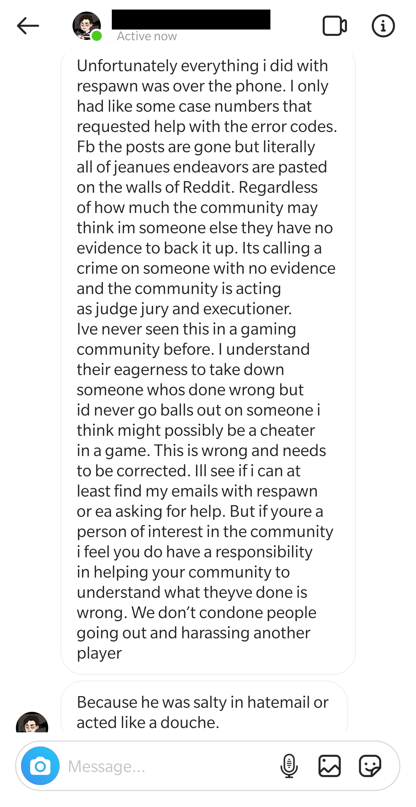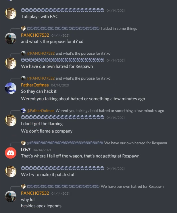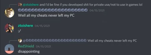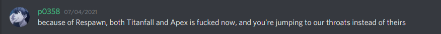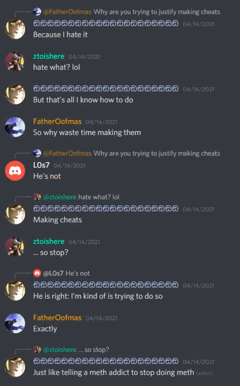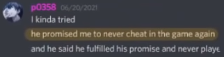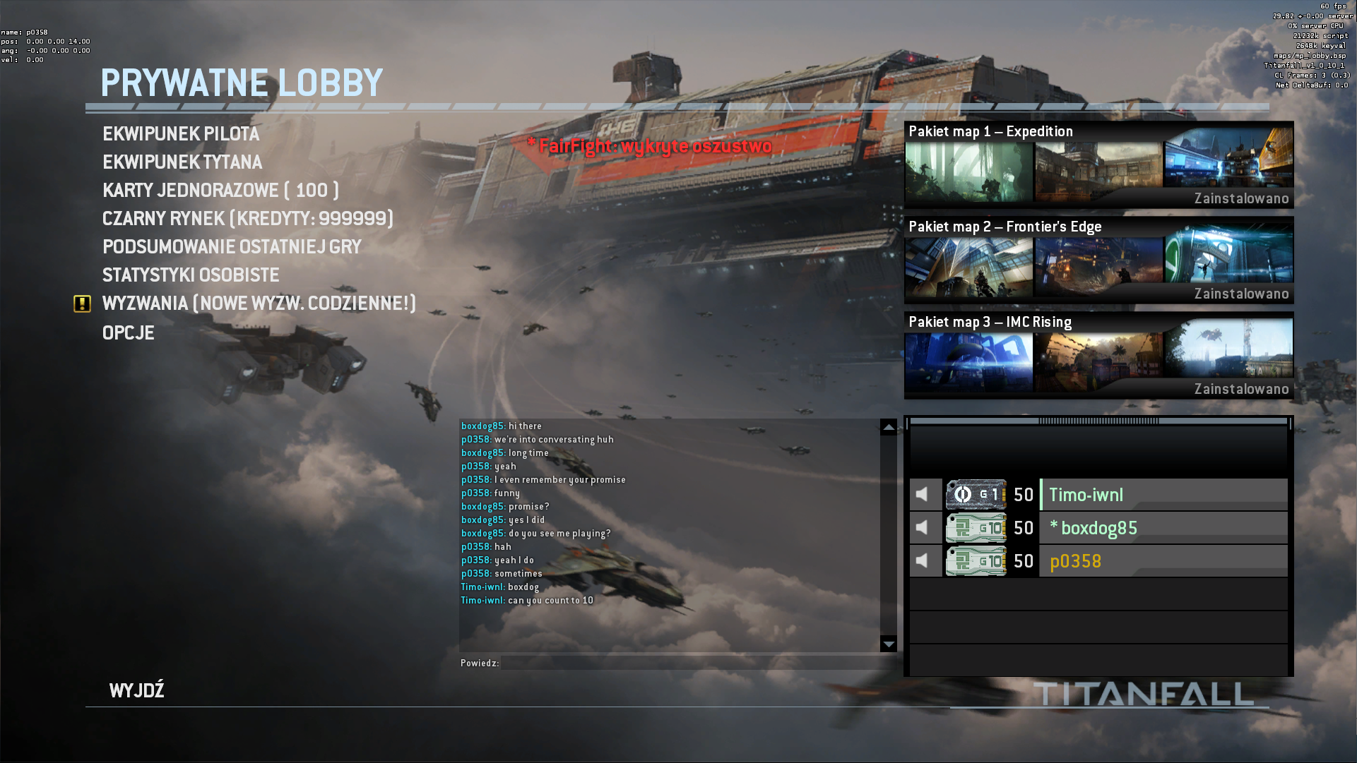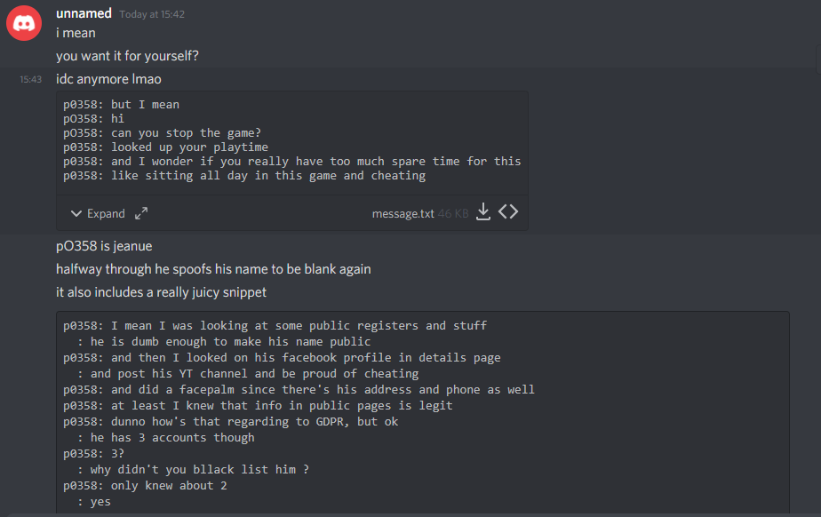 p0358: If you cared to look around at all, the conversation at that point was about one of the cheaters who was proud of his acts enough to brag about his cheating on a YouTube channel with his real name and to also share those videos later on his Facebook account. And I never hid the fact that I used to mess with some cheaters in-game back in 2018, to stop them from messing up the game for others and making regular players quit, and maintained a list of known cheaters along with their usernames, user IDs and links to the evidence of cheating. A questionable act, perhaps, but I did this because I didn't want Titanfall 1 to die. And its population did start to decline rapidly due to the rise of those cheaters, when there was nowhere else to go to avoid them.