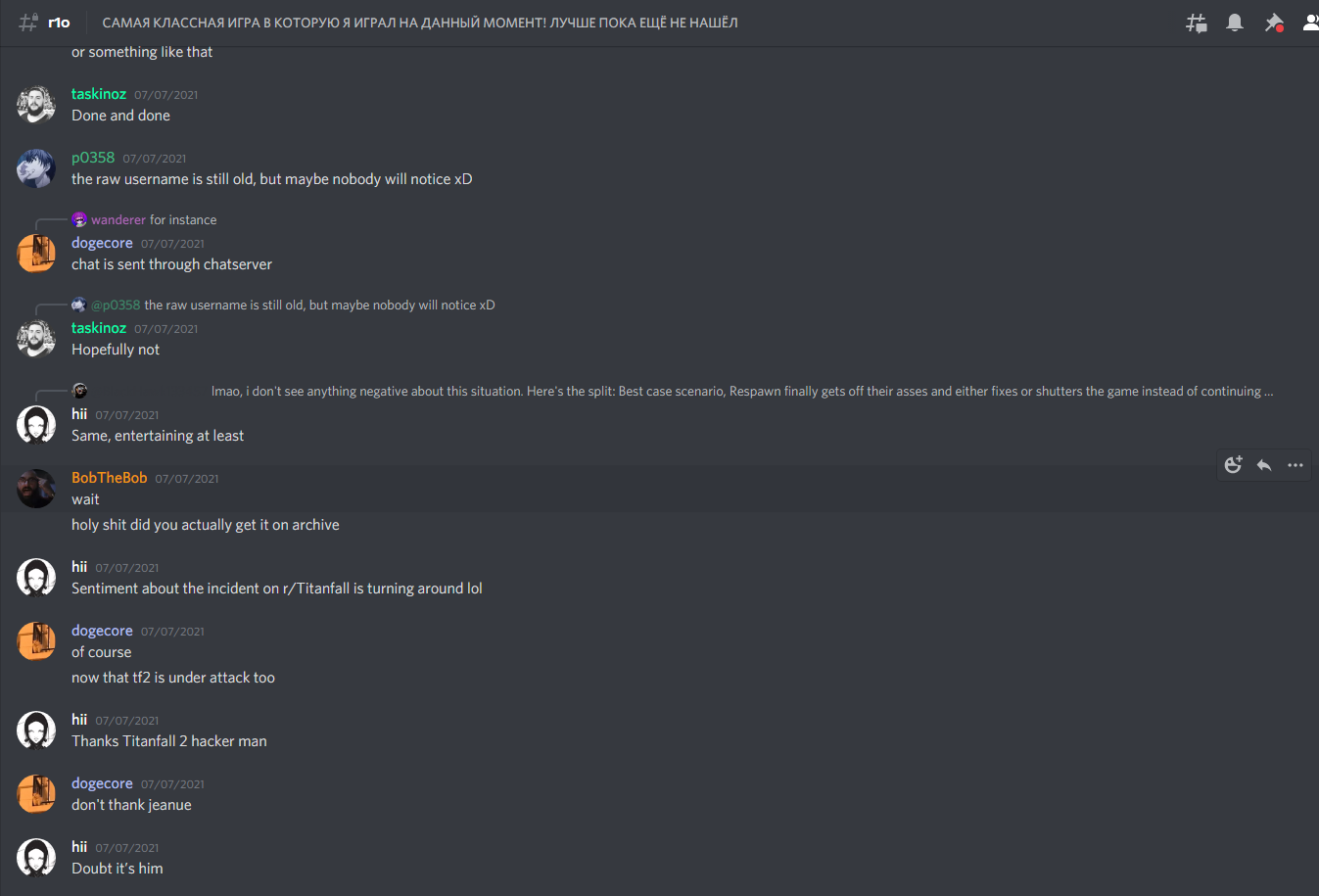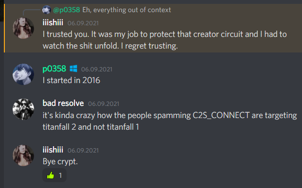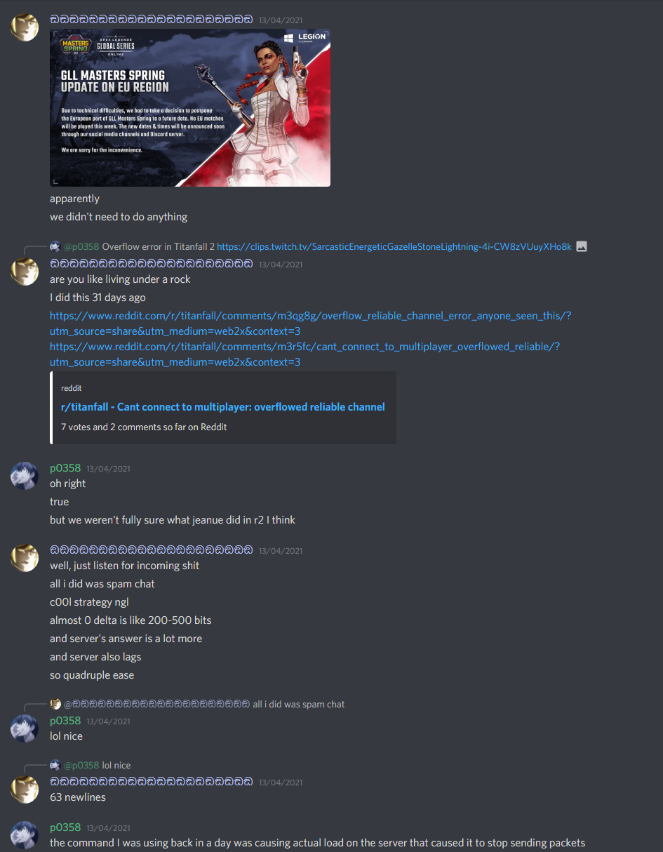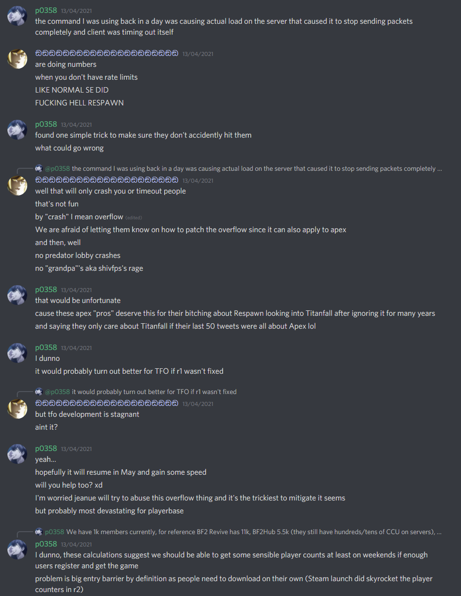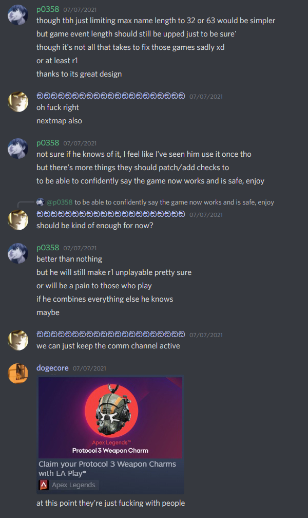 Along the way, Titanfall 2 became a victim of Jeanue attacks with the same exploits that he used in Titanfall 1 since late 2020, starting with attacking streamers and ending up with attacking the whole community. "Creator Circuit" was formed as a response to that, where current information on attacks was gathered, and I, along with a few people from Remnant Fleet, were invited, and I strived to share the knowledge that I had and help out as much as I could. I even wrote an article describing in one place how to fix the game against all vulnerabilities that jeanue was using in the wild, having gotten a new hope of Respawn wanting to fix the game, after they pushed a server-side update for the first time in years.