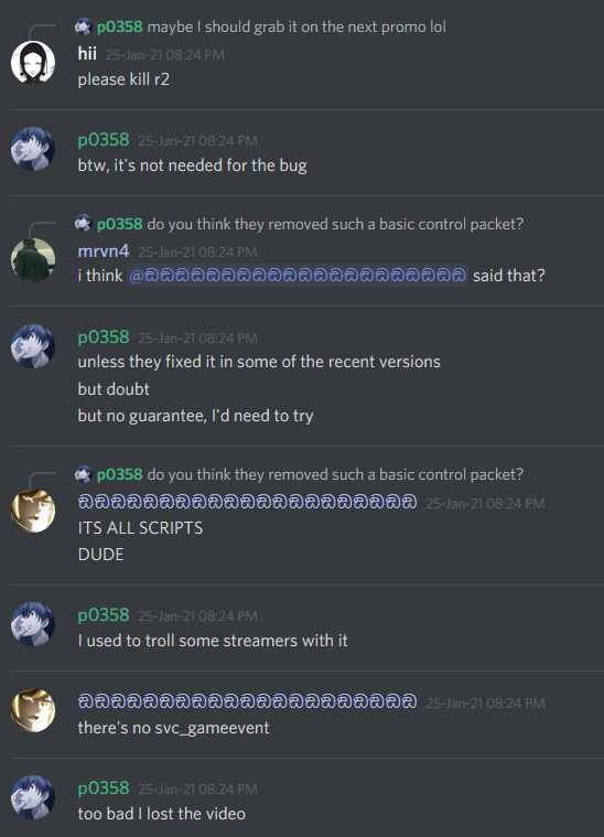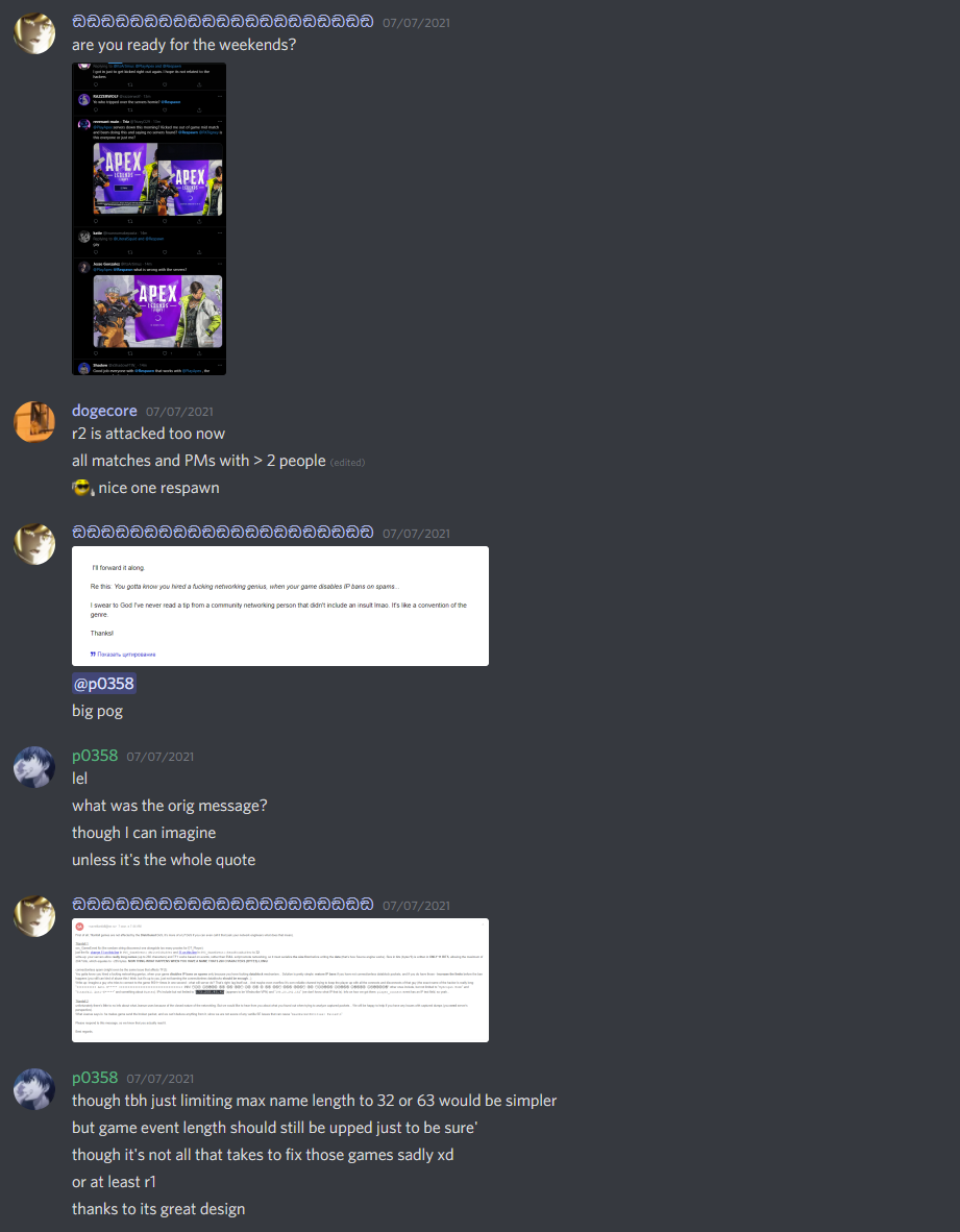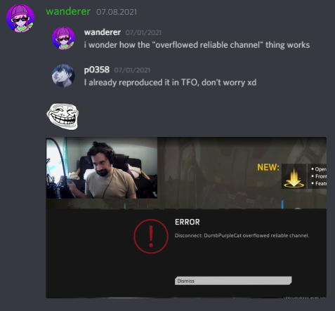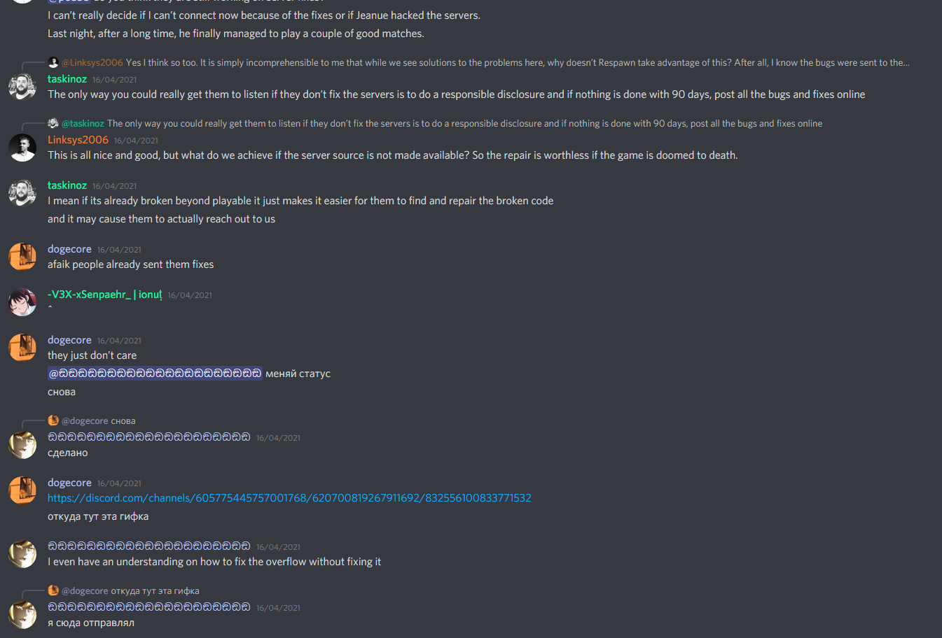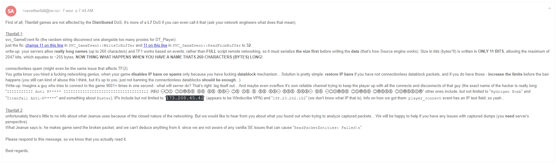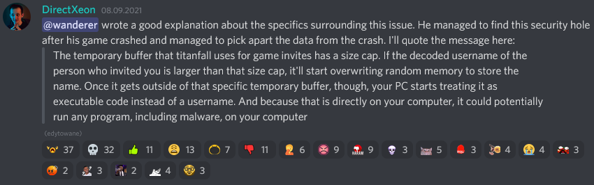 Along the way, Titanfall 2 became a victim of Jeanue attacks with the same exploits that he used in Titanfall 1 since late 2020, starting with attacking streamers and ending up with attacking the whole community. "Creator Circuit" was formed as a response to that, where current information on attacks was gathered, and I, along with a few people from Remnant Fleet, were invited, and I strived to share the knowledge that I had and help out as much as I could. I even wrote an article describing in one place how to fix the game against all vulnerabilities that jeanue was using in the wild, having gotten a new hope of Respawn wanting to fix the game, after they pushed a server-side update for the first time in years.