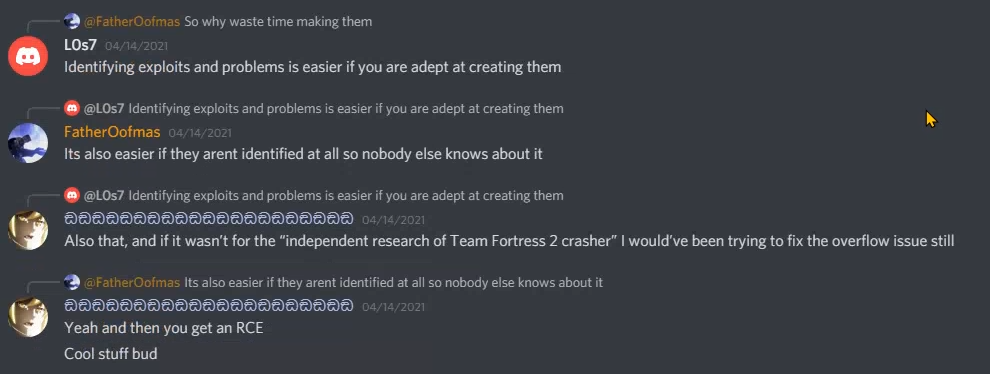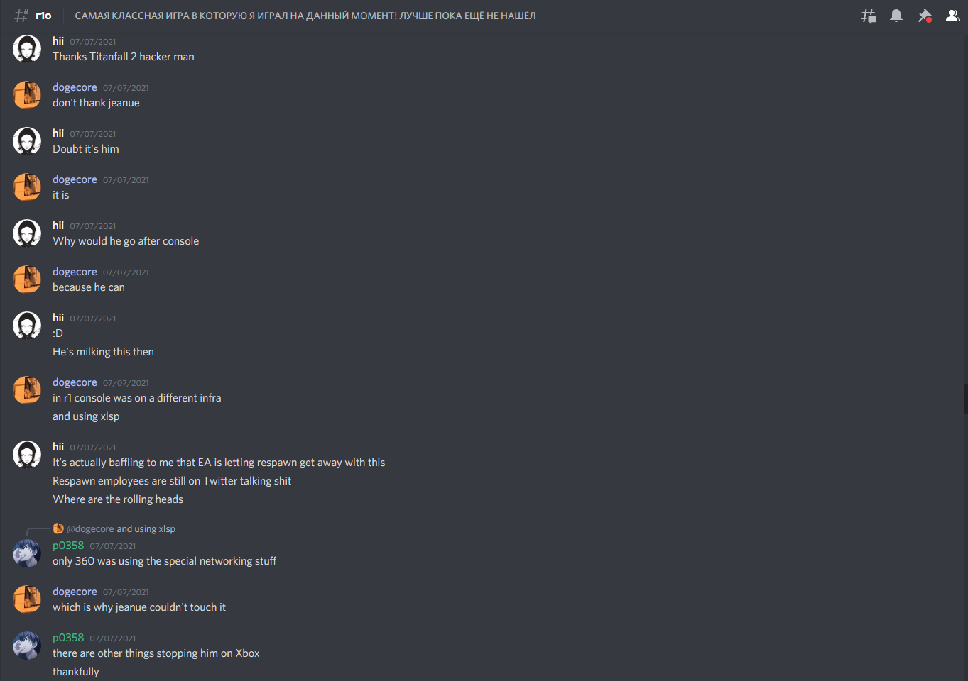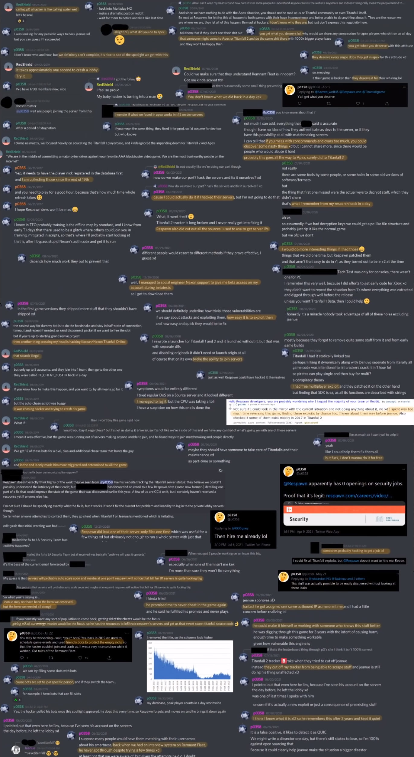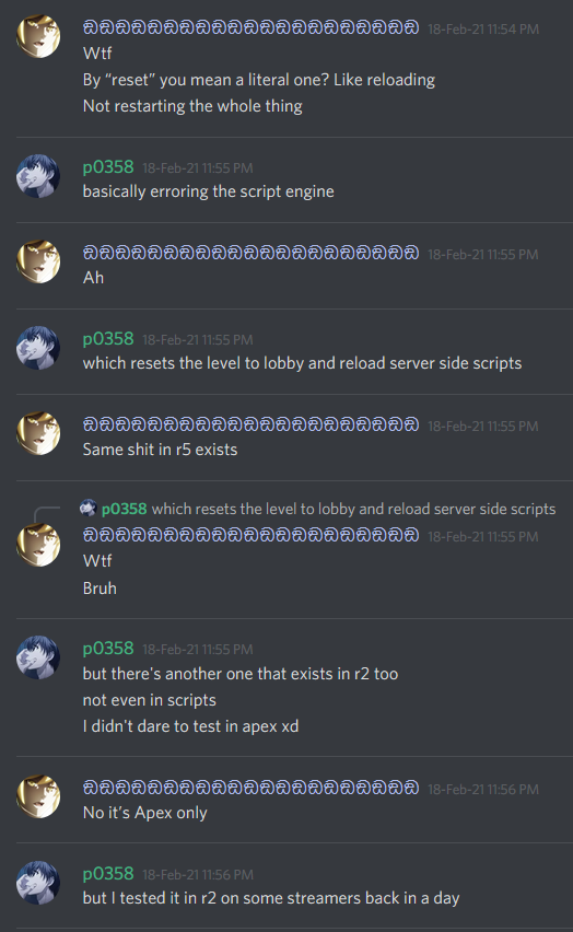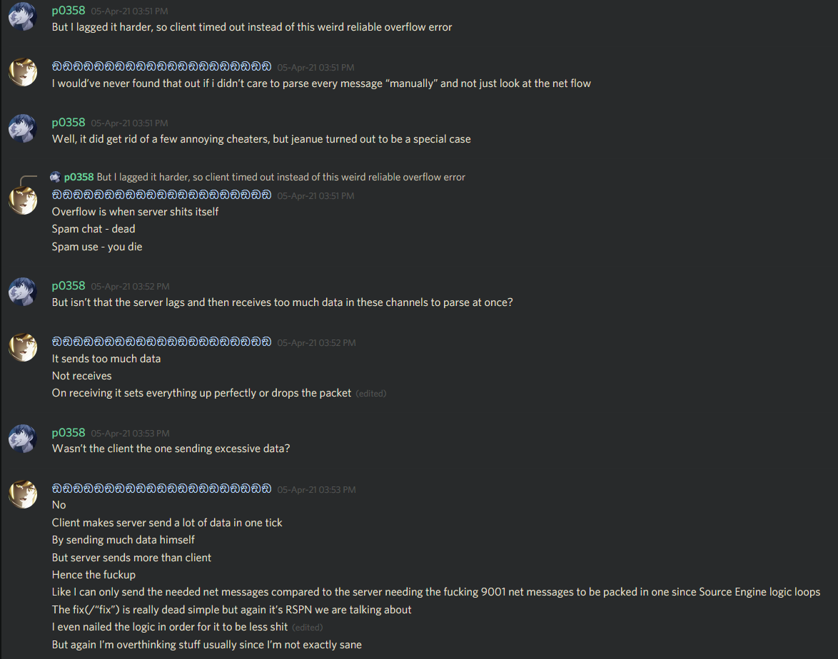 Along the way, Titanfall 2 became a victim of Jeanue attacks with the same exploits that he used in Titanfall 1 since late 2020, starting with attacking streamers and ending up with attacking the whole community. "Creator Circuit" was formed as a response to that, where current information on attacks was gathered, and I, along with a few people from Remnant Fleet, were invited, and I strived to share the knowledge that I had and help out as much as I could. I even wrote an article describing in one place how to fix the game against all vulnerabilities that jeanue was using in the wild, having gotten a new hope of Respawn wanting to fix the game, after they pushed a server-side update for the first time in years.