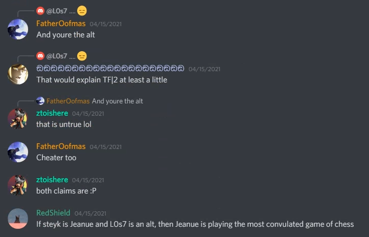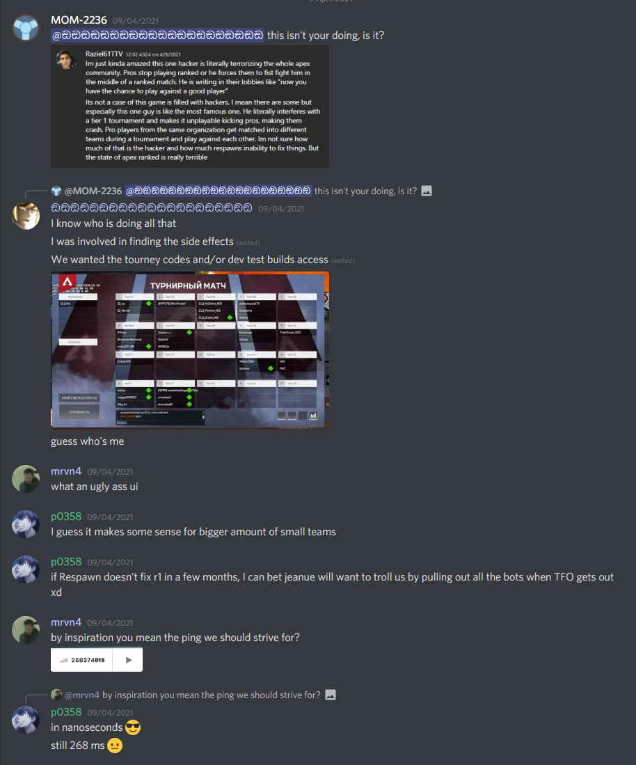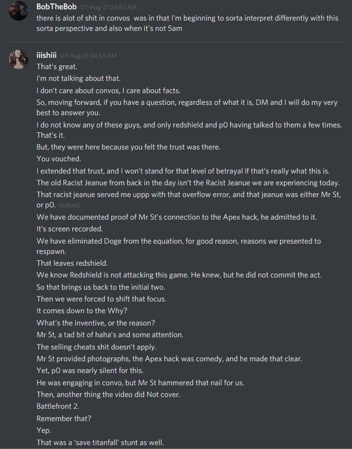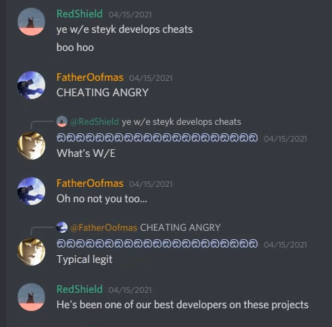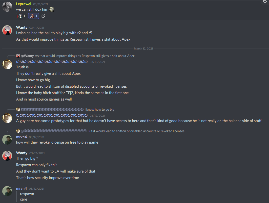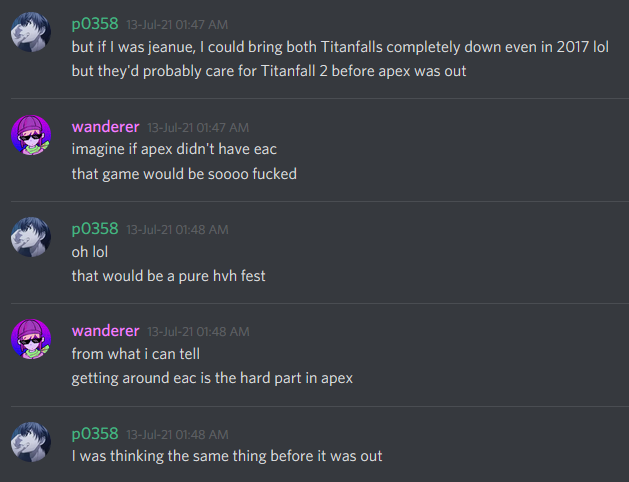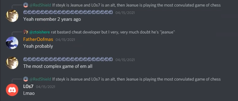 For those that know of me, it should be pretty clear that I’m not cool with Jeanue. I have gone to some great lengths to try to find a way to stop s/he/them. I believe each of us (contributors) do not approve of what ‘Jeanue’ has been doing, we have different methods, and have disagreed with each other about them. But we are still able to have civil discussions and recognize that we’re on the same team. Yes, Steyk develops cheats, which is interesting at a technical level but I don’t appreciate them being used in legit lobbies. Yes, Steyk admitted to me he was doing Apex at the time, which I also felt was probably a bad idea. But we do both agree that Jeanue has gone too far.