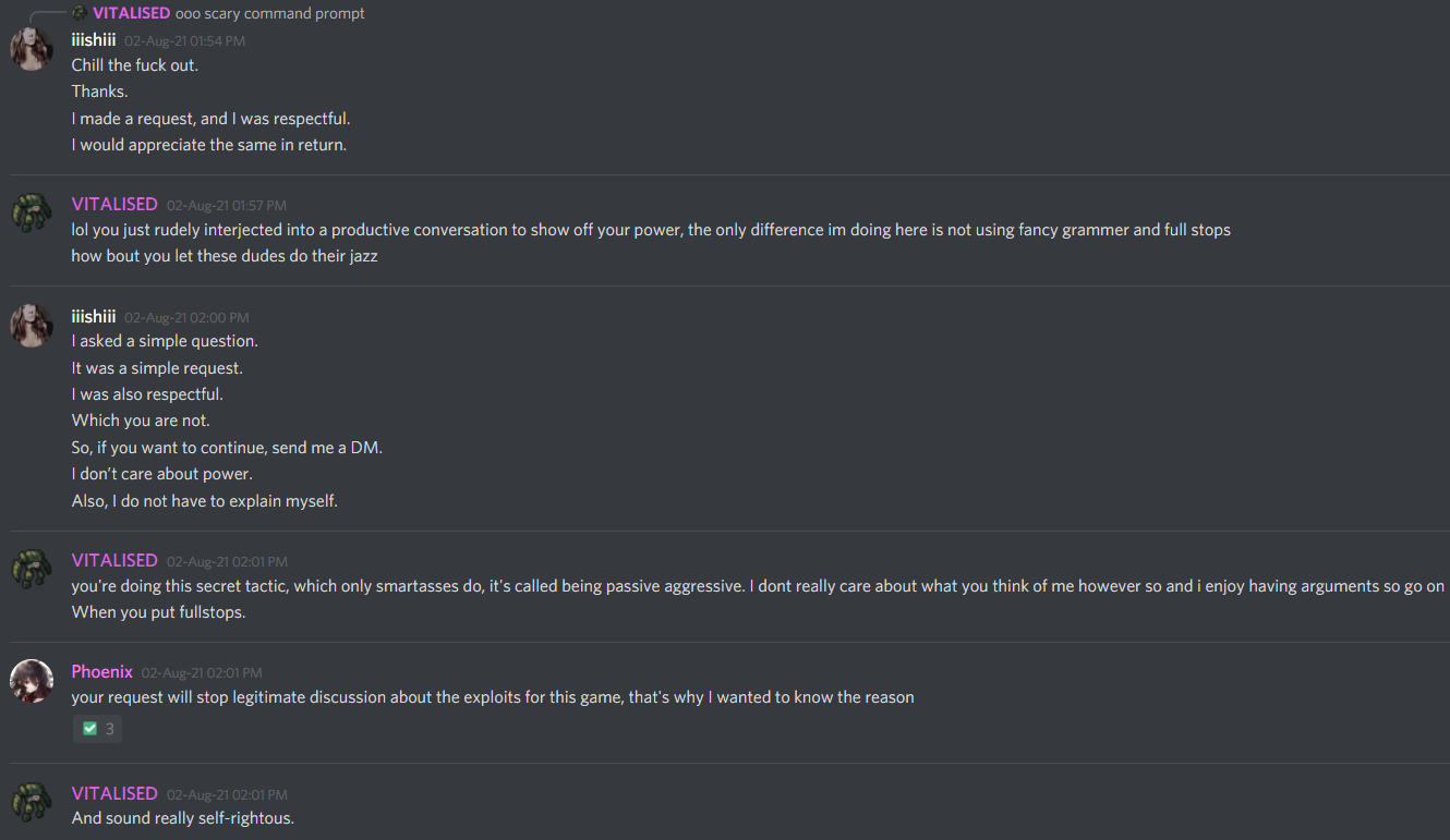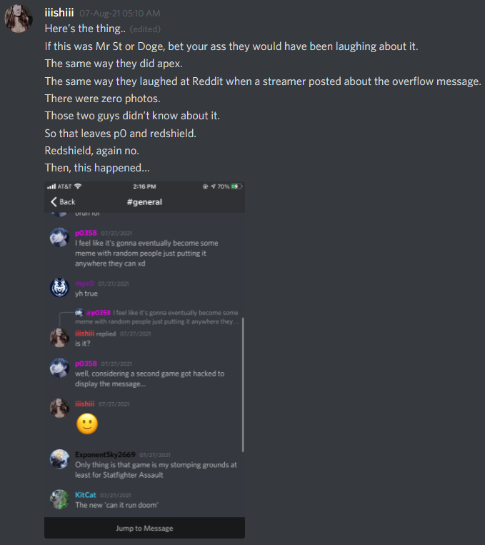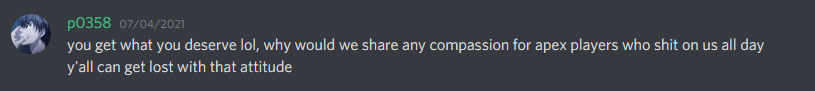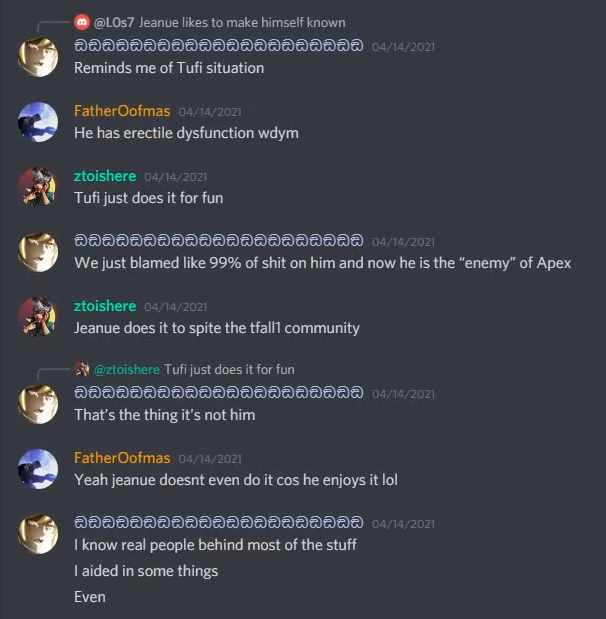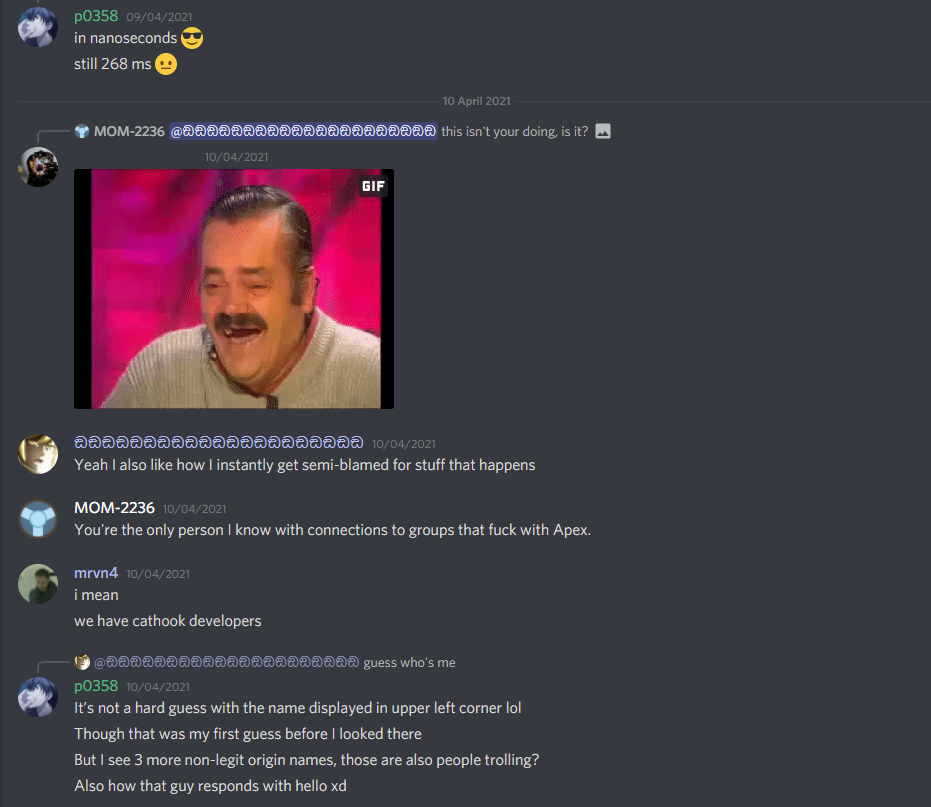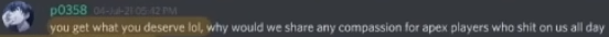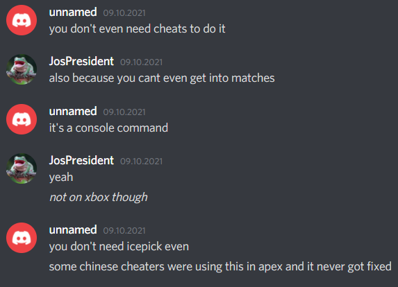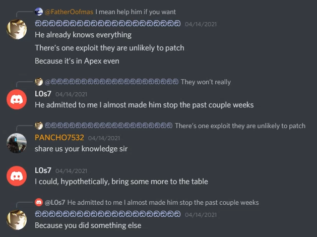 For those that know of me, it should be pretty clear that I’m not cool with Jeanue. I have gone to some great lengths to try to find a way to stop s/he/them. I believe each of us (contributors) do not approve of what ‘Jeanue’ has been doing, we have different methods, and have disagreed with each other about them. But we are still able to have civil discussions and recognize that we’re on the same team. Yes, Steyk develops cheats, which is interesting at a technical level but I don’t appreciate them being used in legit lobbies. Yes, Steyk admitted to me he was doing Apex at the time, which I also felt was probably a bad idea. But we do both agree that Jeanue has gone too far.