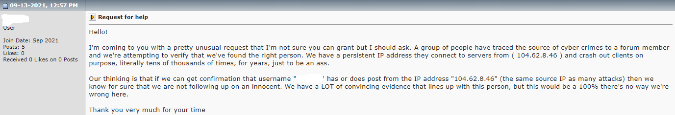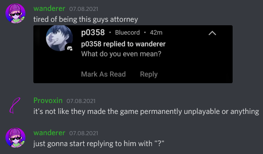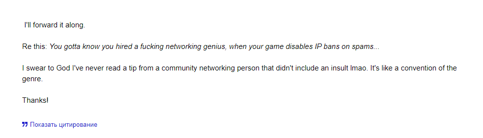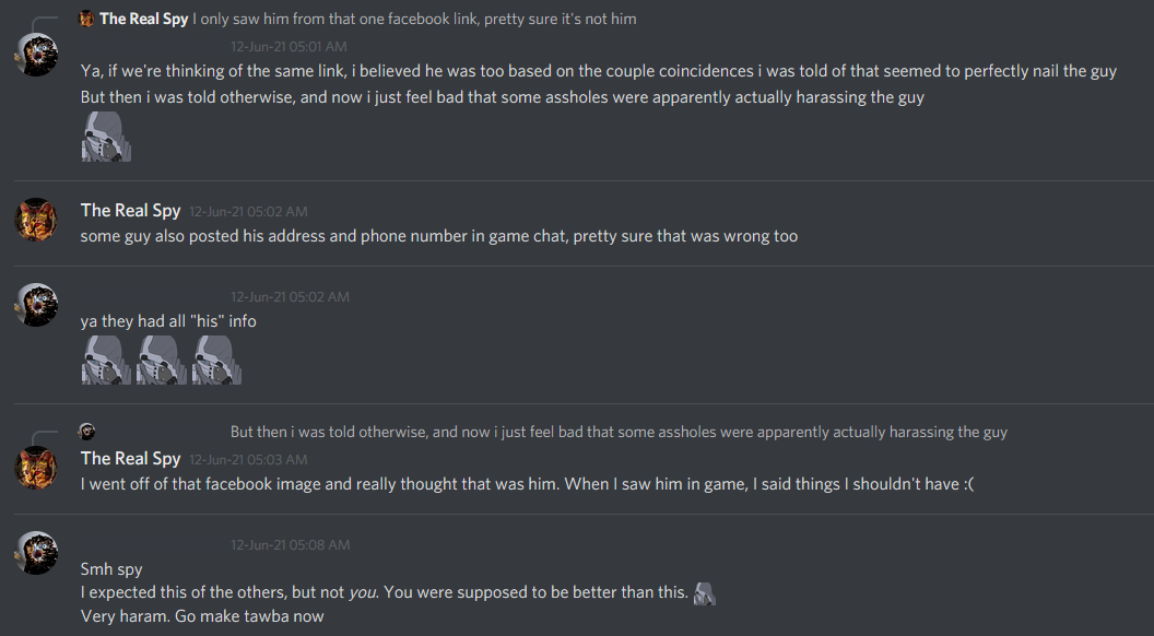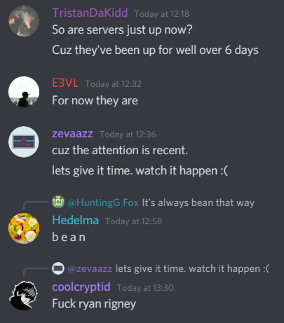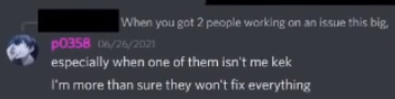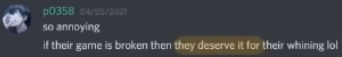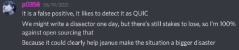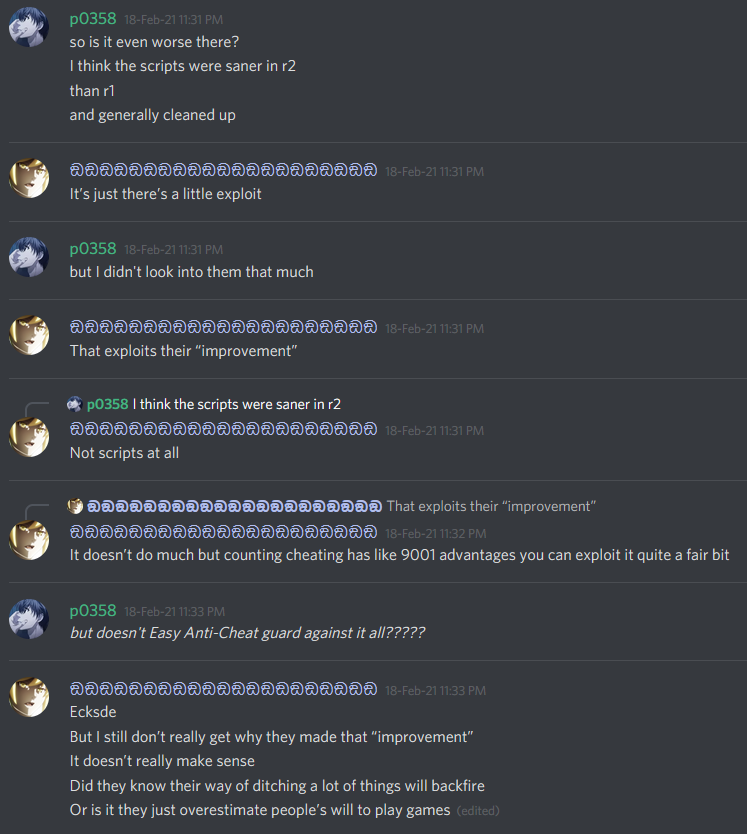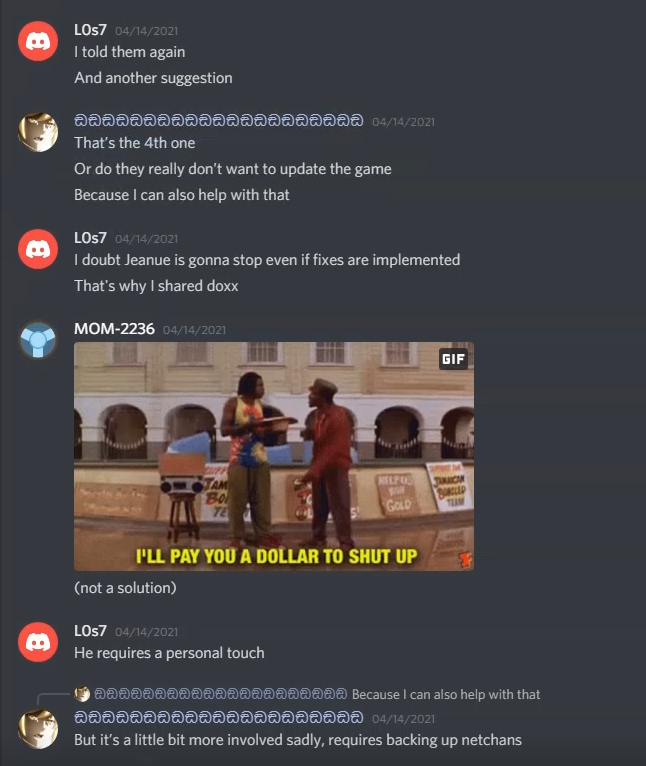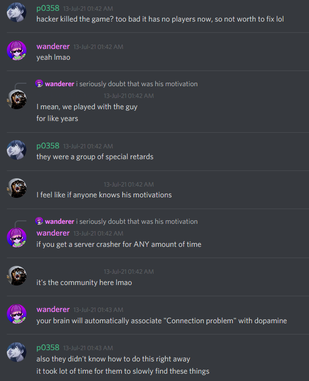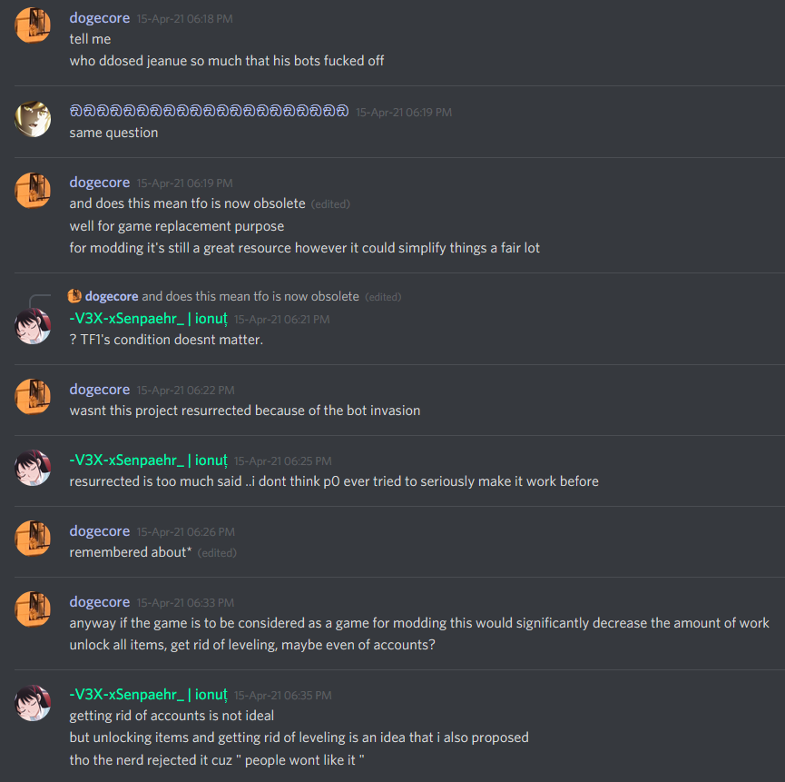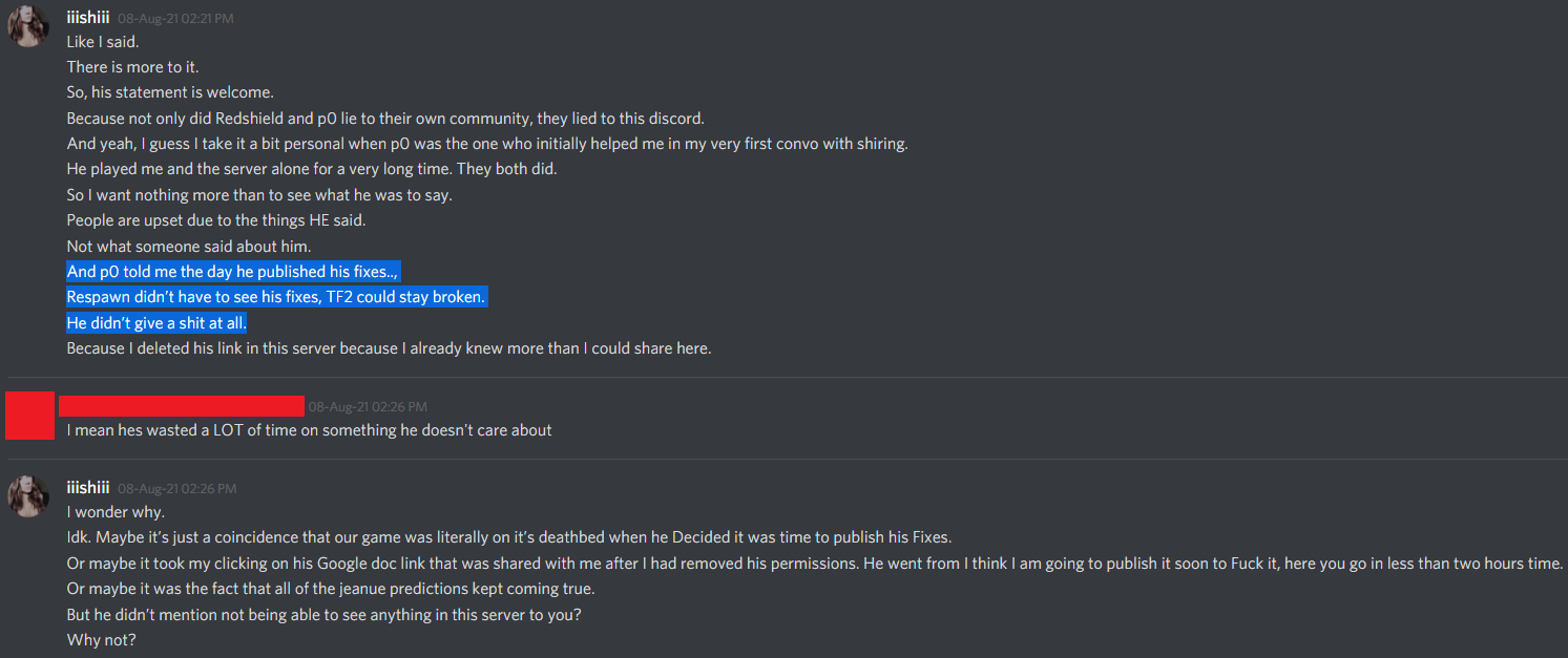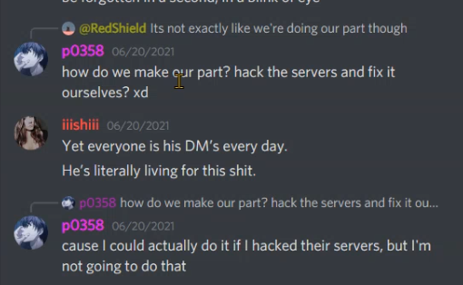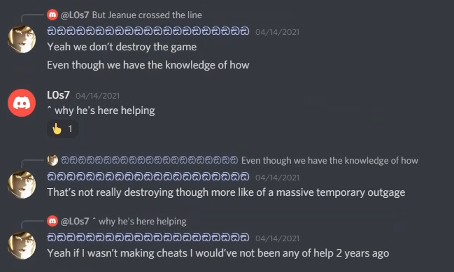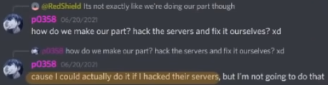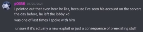 Oh yes, in that conversation file there were even more misunderstandings about its contents, coolcryptid did later shed some light on one of them and how your group understood it. Basically p0358 was mocking jeanue for his complete inability to even make a proper HTTP request to the point jeanue left the server out of frustration, which they claimed was "p0358 helping jeanue". The "REDACTED" sensitive requests mentioned were simply the requests that the game literally makes every time you press the "PLAY" button on the main menu. And his inability to even reproduce such a request was simply laughable. Perhaps you could know this if you asked someone competent about it, but all of those were distrusted as "hackers" after all...