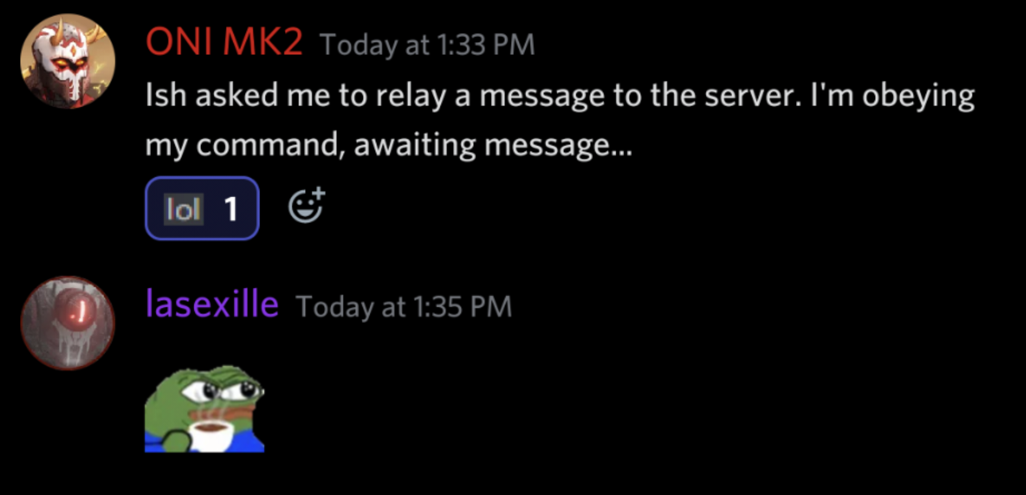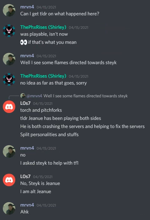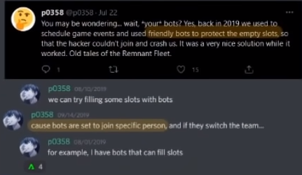 p0 and RedShield started Remnant Fleet and organized TF1 events, since p0 had discovered a way to bypass Jeanue’s bots. I participated in some of these events, which Jeanue also tried to forcibly join multiple times and try to crash our games. All of this to basically say that I still consider p0 to not be the bad guy here.