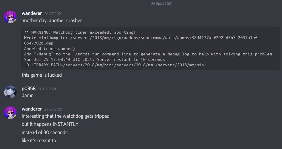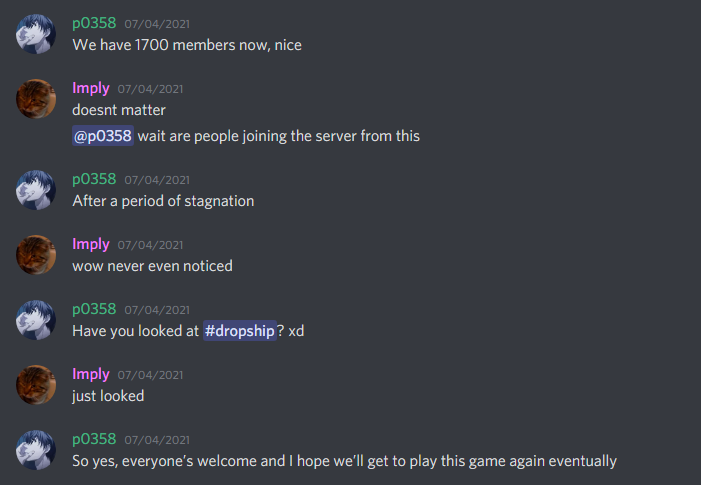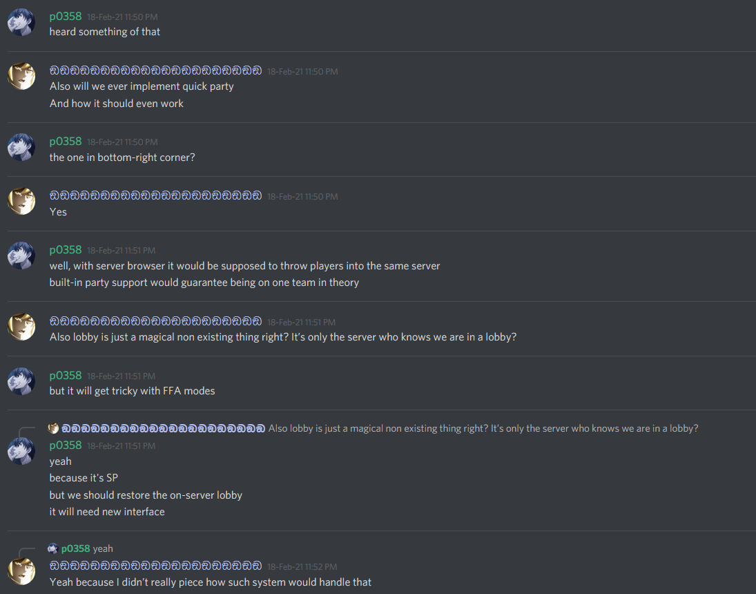 I learnt of that server soon after and joined. The idea was very refreshing, since none of my previous thought processes around what could be done next assumed having a coordinated group of people. Thanks to my knowledge we could gradually automate the game-forming process over time. Without me, the whole initiative would have probably died within a few weeks. In the course of months, from having two team captains get joined by teams and go to matchmaking (where any failure, including someone randomly disconnecting, would mean jeanue would join within a few seconds and screw up everything), we ended up with a fully automatic and reliable solution which required a single button press in a program, and once everyone was ready, it would connect everyone directly to a matchmaking server, a trick which was possible thanks to my knowledge of how Stryder works from two years before. Then we didn't even need 12 players, because friendly bots would guard the missing spots, with the ability to replace them with incoming players on demand.