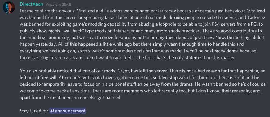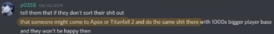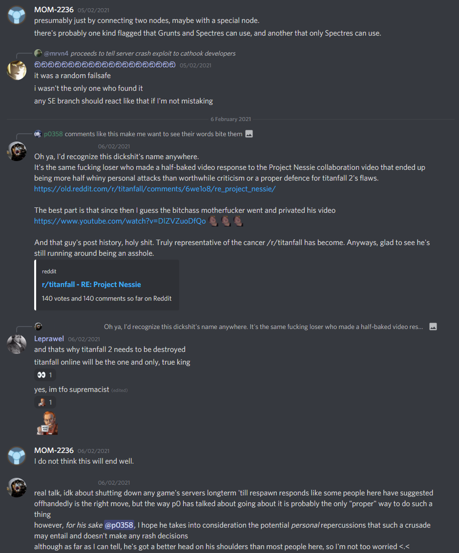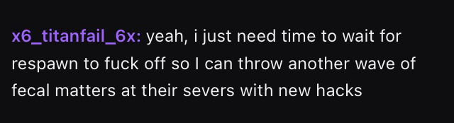 - Publicly shaming the names of many respected people in the Titanfall modding community who tried to do something about the attacks, attackers, or just help the community in any way.
