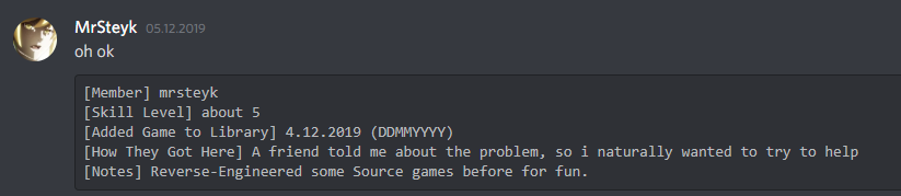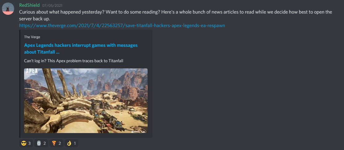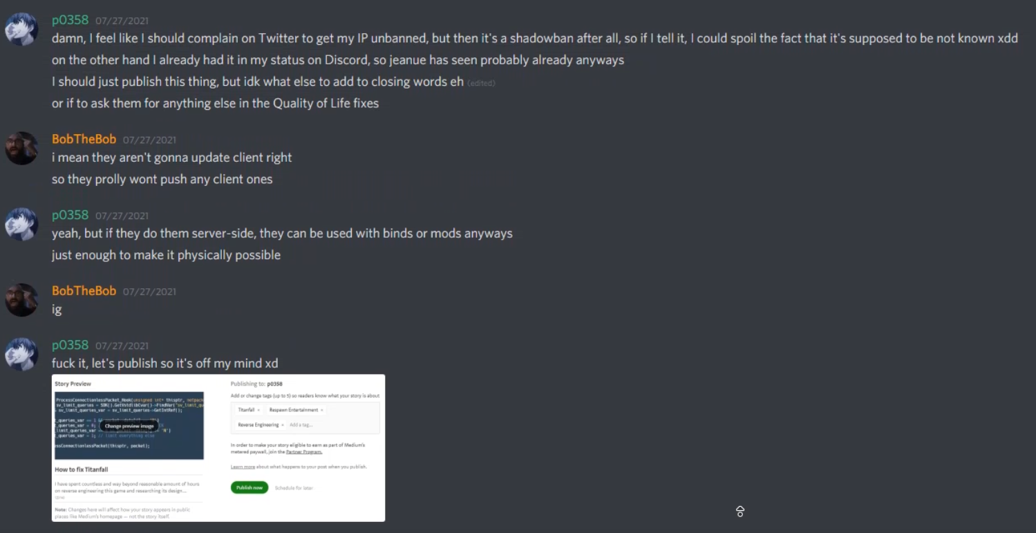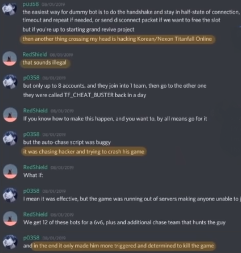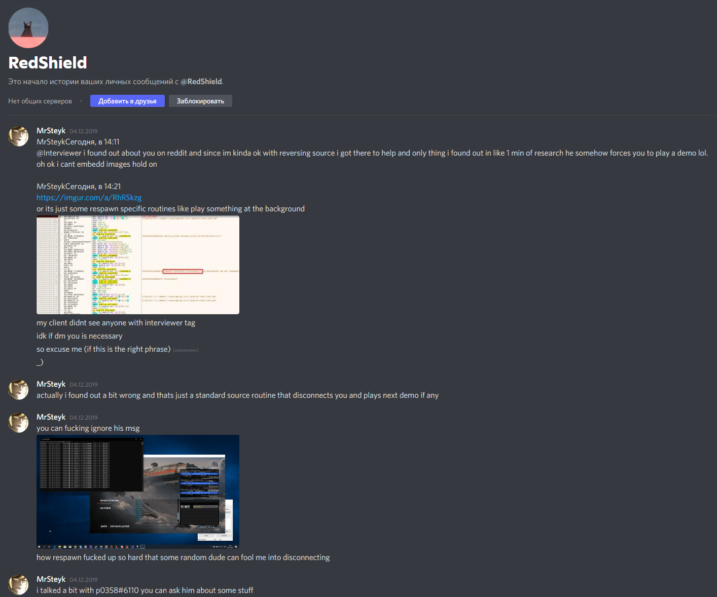 My journey with this game began with my pal explaining the situation that's been going on with Titanfall 1 and asking if I can try to leverage that. I naturally agreed, got an invite to an intermediate Discord server and filled an application to RedShield. In the meanwhile, I've been reversing the network flow specifically. I knew you can't simply make a client disconnect without forcing it to (timing the server out, using a command, shutting down netchannel and sending a disconnect packet, etc). That's how the original fix surfaced. After that time (December 2019), I was barely seen in-game and played enough to be level 17-19 Gen 1.