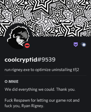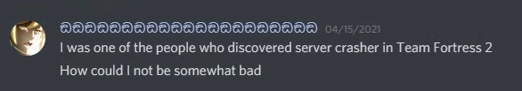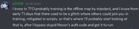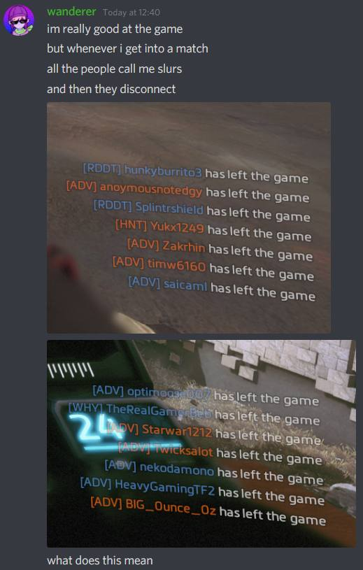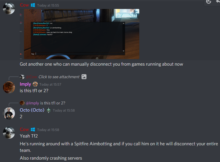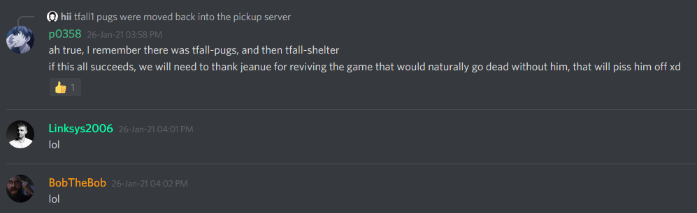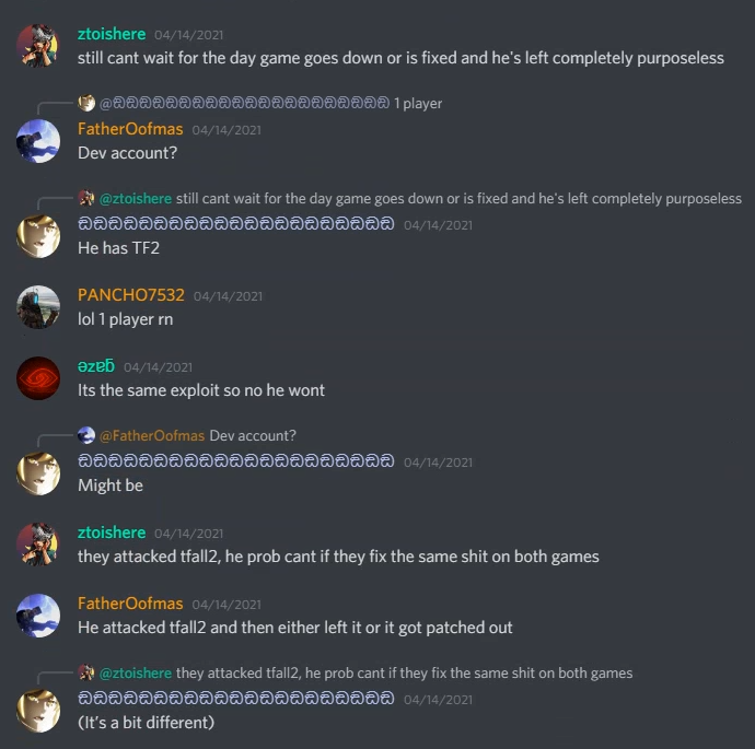 The first time I had heard of p0 (EU player, I’m a NA player so we didn’t cross paths) was through another player. We were in a lobby with Jeanue and my friend started telling me he’s going to message “p” to come boot Jeanue from the game. Apparently “p” knew some commands and could break the matchmaking temporarily for a specific player (Stryder would not put you in a lobby for 30-45min or something). “P” had used this on Jeanue a couple times to get him out in order that people could play normally. Once Jeanue saw that this was possible, I guess his interest was piqued about how. He would constantly ask p0 how to do it. I can specifically recall playing a match on Boneyard in 2018 that Jeanue was in and he was telling me that s/he had been studying the server API through p0’s TF stats page, and that ‘we’re fucked’ or something like that when s/he’s done. Remember that at this time, TF1 was perfectly playable (aside from Jeanue just annoying lobbies), no one talked about private servers, etc. Well not too long after that, Jeanue figured out the long name exploit, then scripted it to run 24/7. TF1 was unplayable for more than half of 2019.