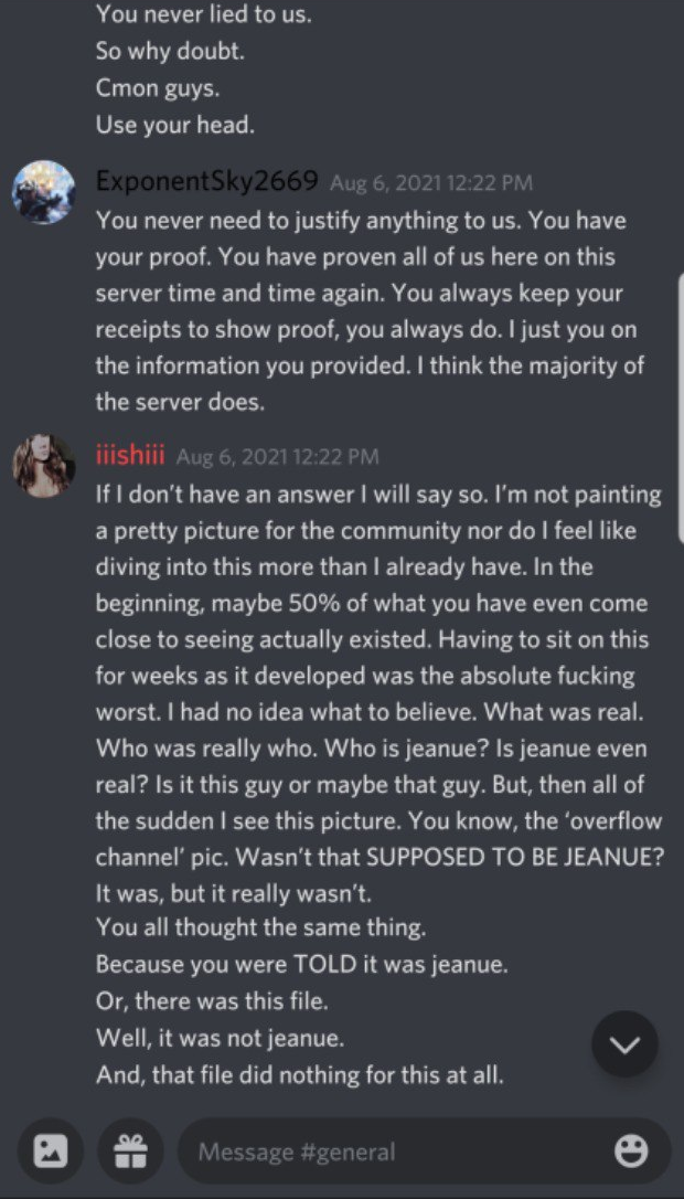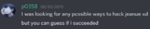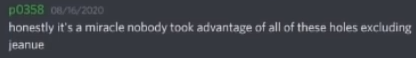 - The implication that MrSteyk/dogecore/p0358 took up the mantle of Jeanue is still false. They only ever reverse engineered what Jeanue was exploiting to cause crashes, then tested it once or twice on public servers to see if it gave the expected result. The original Jeanue is still around and was never really gone.