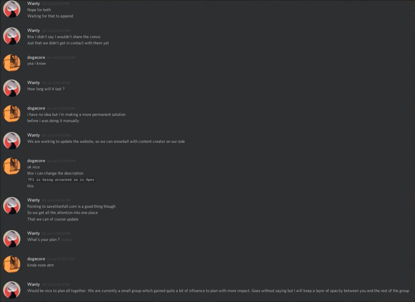 - Leaked DMs with dogecore show how Wanty was saying nice things about 4th of July incident of Apex Legends, suggesting changes to the in-game messages and asking if more attacks like this are possible in the future – being actively involved in shaping the form of the attack.