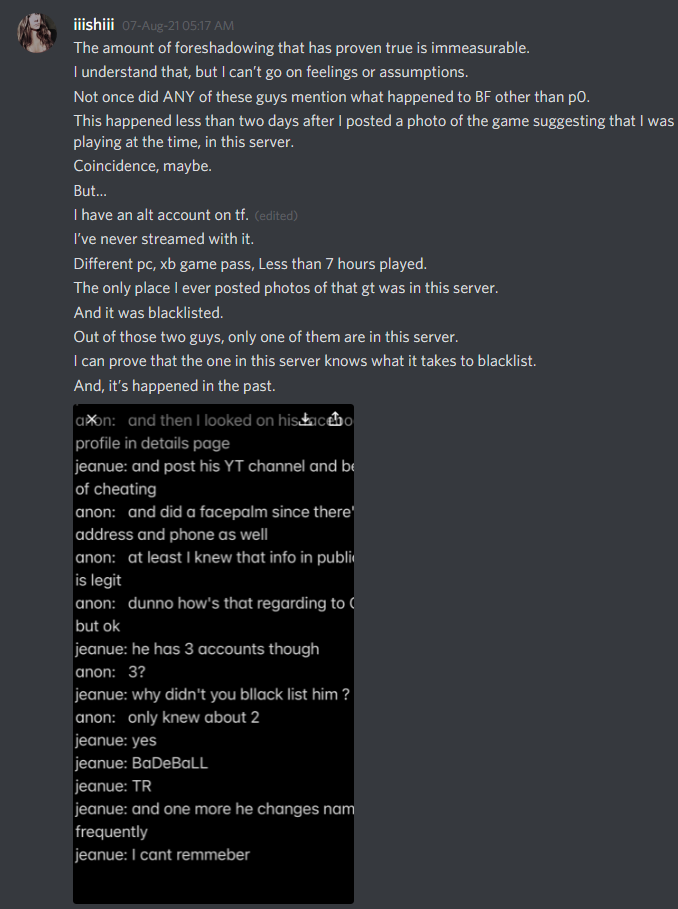 About those blacklists and gamertags, you ignore the fact that people who didn't show their name anywhere on their streams also got blacklisted — so clearly no presence on the server or former knowledge of the gamertag was needed. But it doesn't add to your agenda, so you ignore it. Fact is that Jeanue was finding people through pattern matching and checking which players meet all the conditions, which only left him eventually with one possibility — and it wasn't a rocket science to figure out for anyone with a brain. This is simply literally the only method he could have used for that.