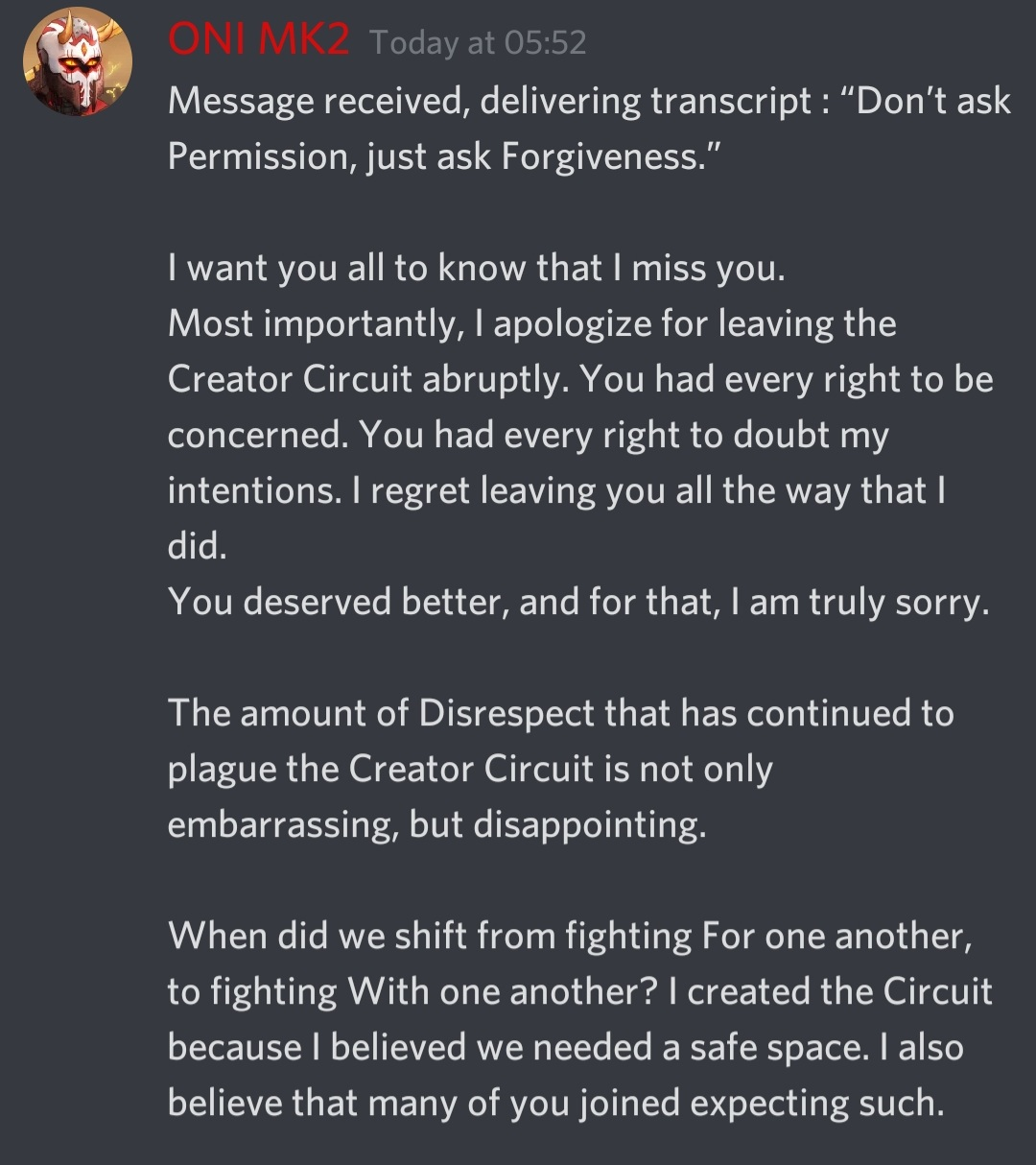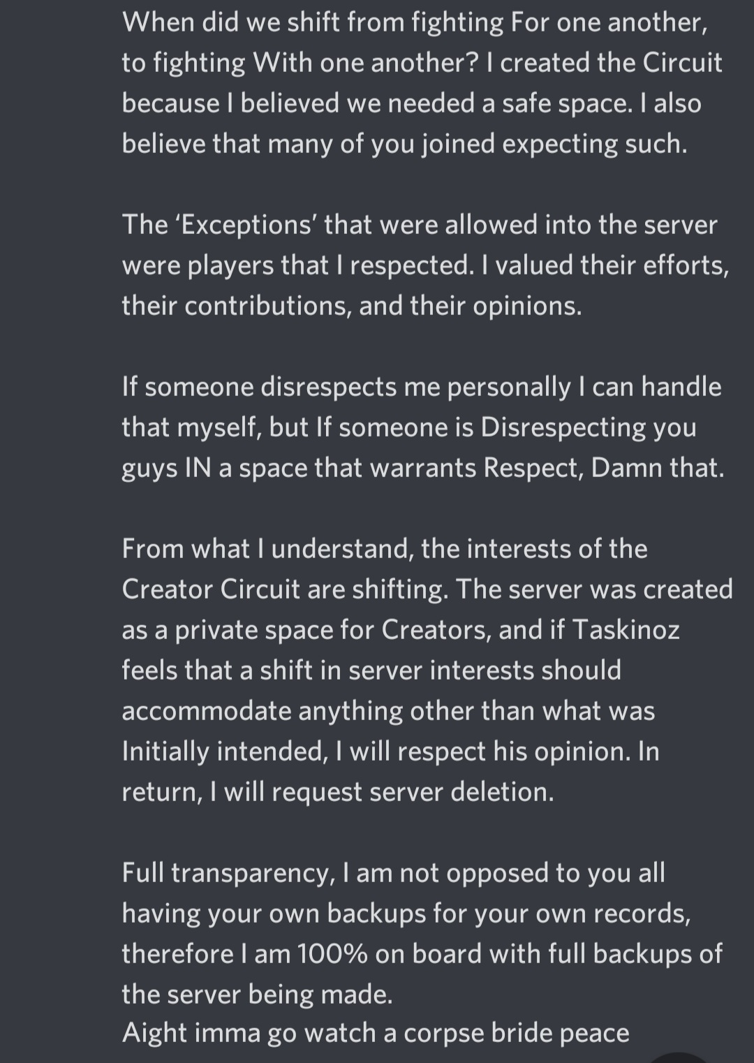 - Creator of the formerly secretive "Creator Circuit" Discord server, meant to unite streamers and youtubers around the situation of the game attacks, and to collect the latest information on those attacks.
