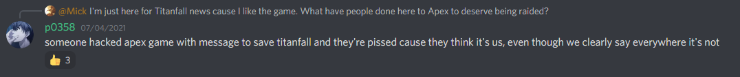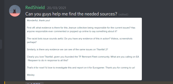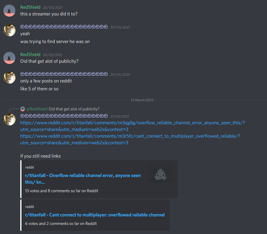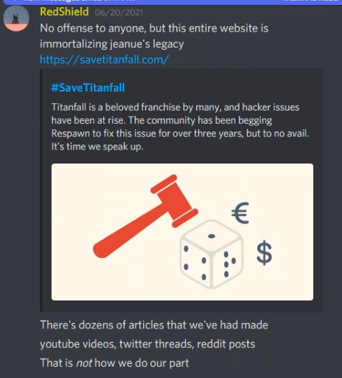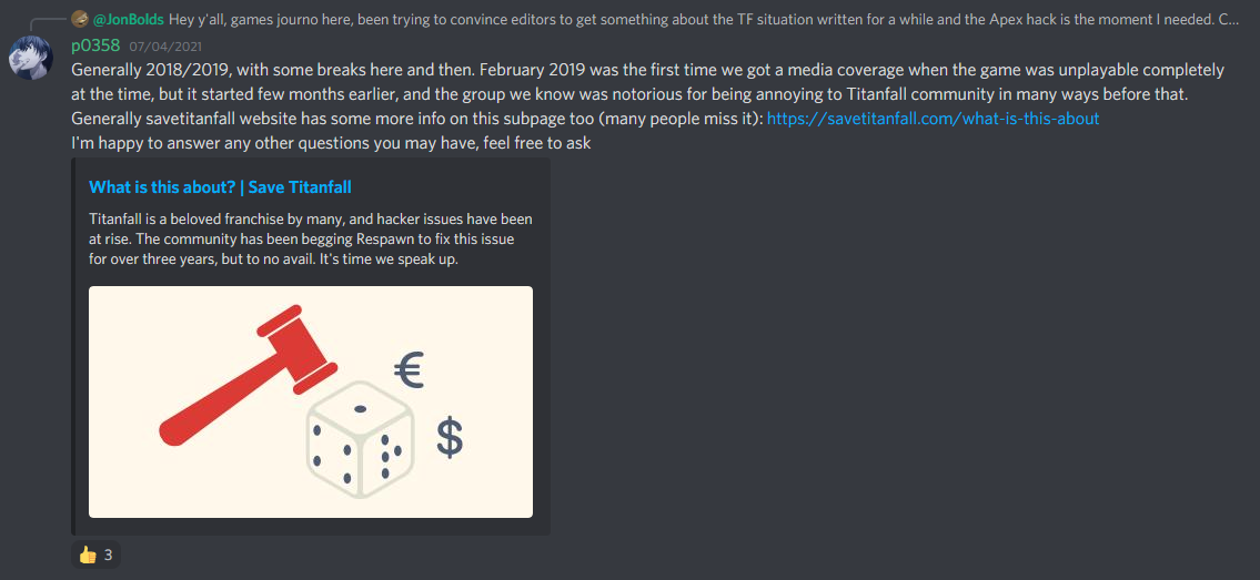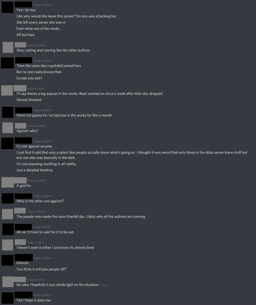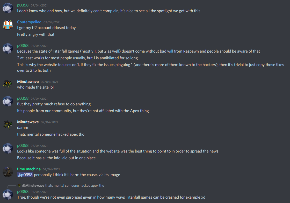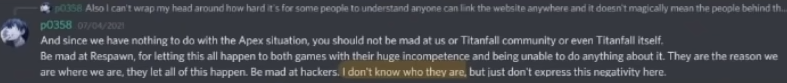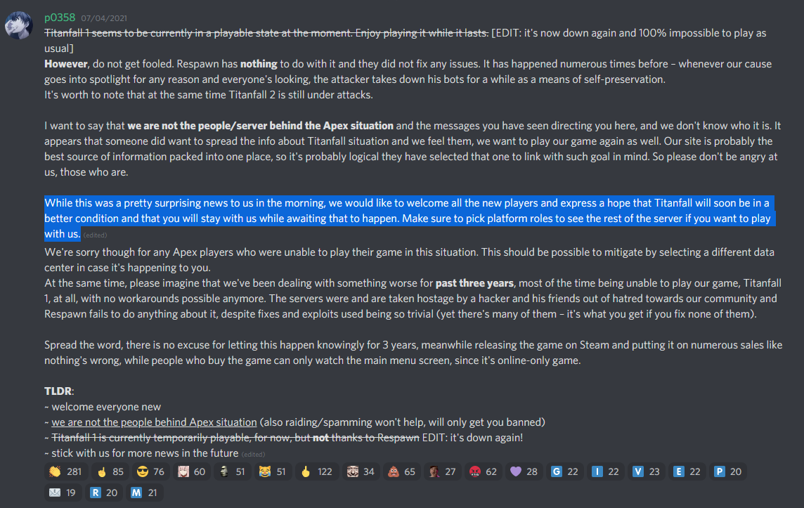 - Had no previous knowledge of details and history surrounding Titanfall 1 attacks, nor of the community's fight against them.