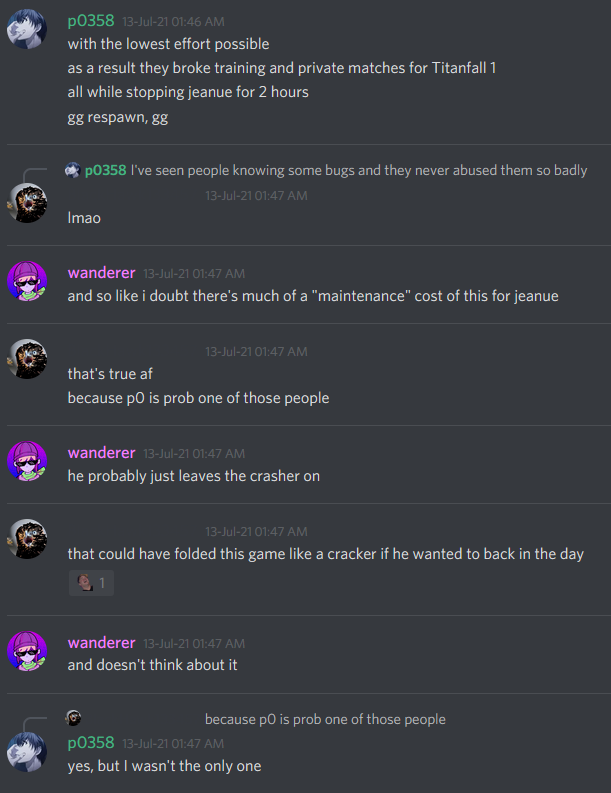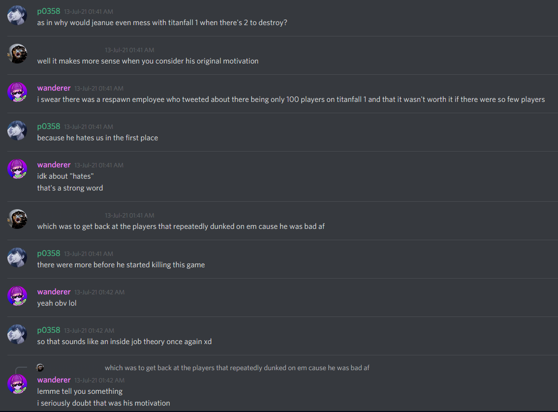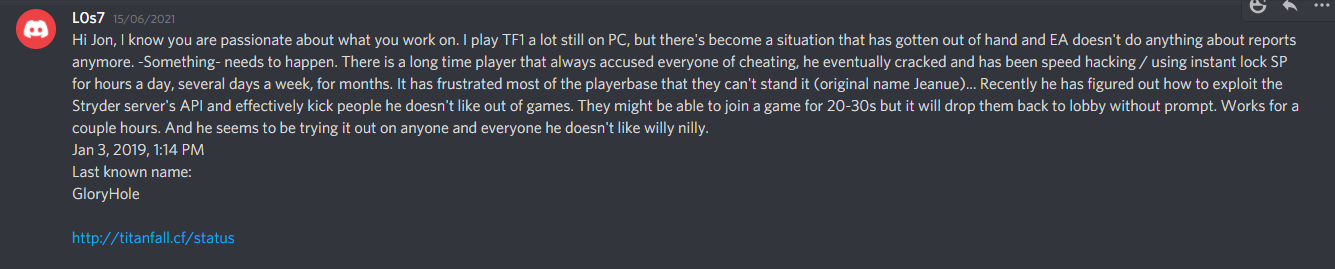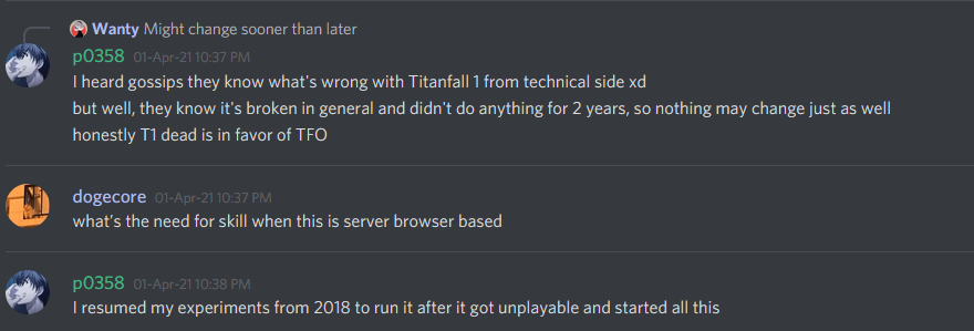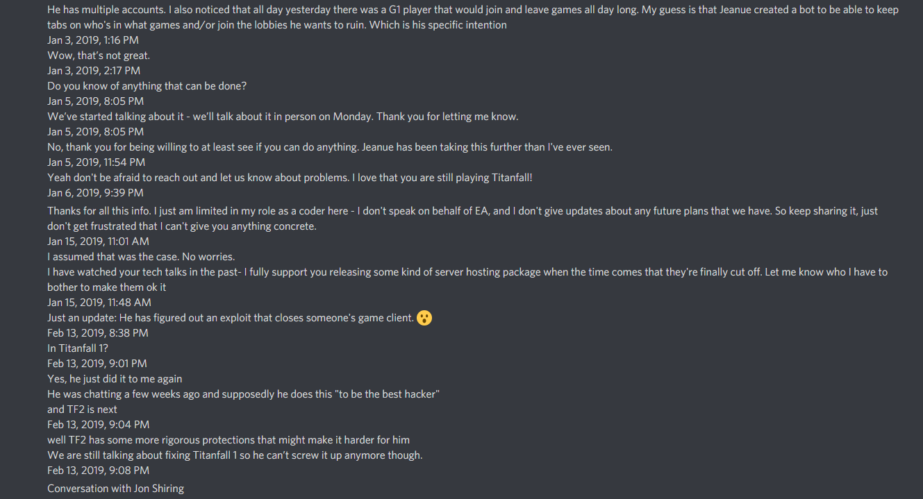 We will provide the context for every screenshot included, some of it going as far back as 2017. The long story of Titanfall 1 issues and the arms race between the good and evil consists of many chapters, but most of the community was not aware of it up until late 2020, where Jeanue has eventually killed Titanfall 1 with its servers becoming a ghost town, and after a period of boredom decided to go after Titanfall 2.