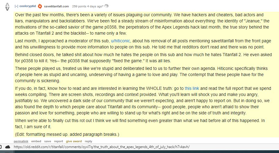 Those who claimed to present the ultimate reveal of the villains, did in fact lynch innocent people (those who did actually try to help Titanfall, to make things worse), and simply lied and made everything up (being only partially right about Apex hack, but also being a part of it no less than those whom they accused at the same time).