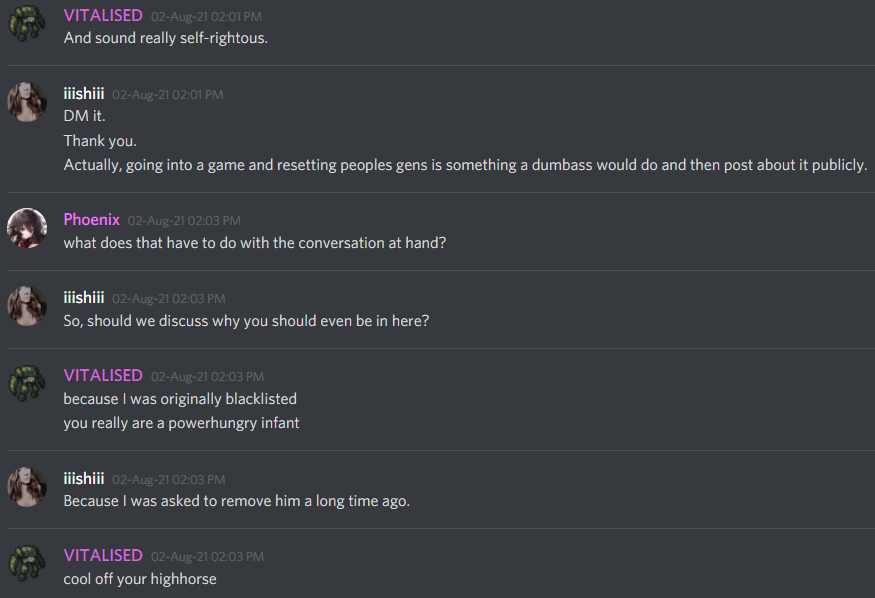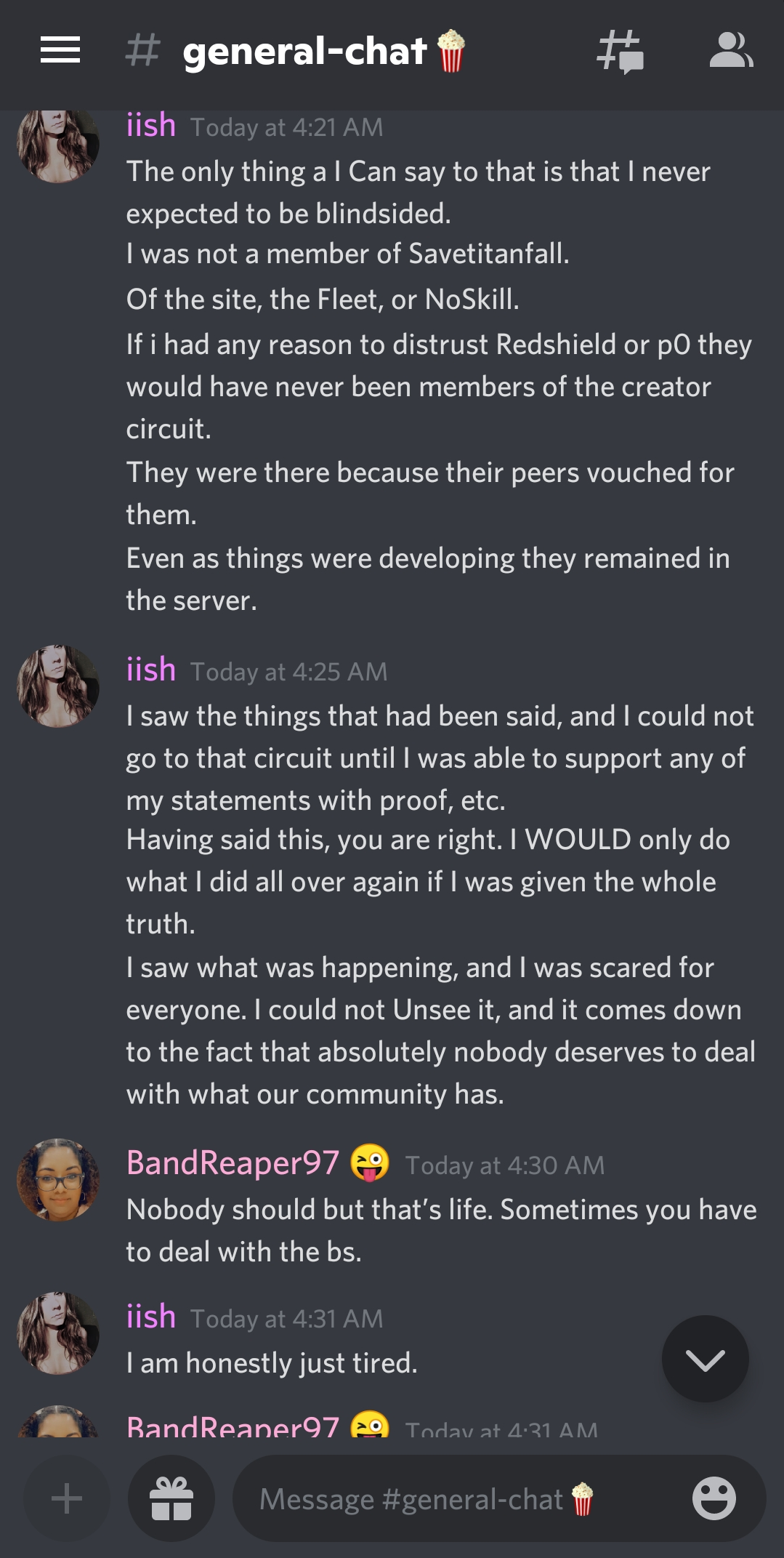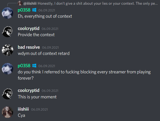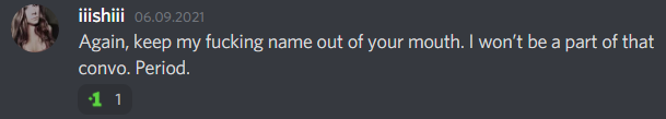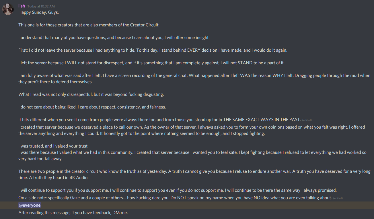 There's also the last person remaining — iiishiii — who on the other hand just pretends to be done with everything. Her "I'm out" has become a catch phrase at this point. But these actions are meant to just deceive people. To be able to trash-talk people from the backseat and continue all her actions, playing the first fiddle, but try to avoid any responsibility should they end up getting exposed for all their wrongdoing (which this document tries to achieve). She passed the ownership of Creator Circuit to someone else, but tries to do a backseat moderation on it at the same time and then even demanded its deletion, and is trying to turn everyone against her targets silently in private messages. Everything she says at this point is one big deception. And it sadly seems unlikely to change, so long as people will support her in that and let her stay in her bubble of delusion.
