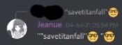 Jeanue has been learning about the Titanfall infrastructure since at least 2018. I know as I’ve been around since the very beginning, playing many games with Jeanue before he went illegitimate. I’ve watched his/her progression (and been a prime target). For those that don’t know, Jeanue was an extremely bad player at the beginning- and rather petulant. As after losing badly for a period of time he’d essentially stop playing and non-stop throw insults (racist included) at those beating him. Obviously, most of us just gave him shit right back and it blew his lid off.