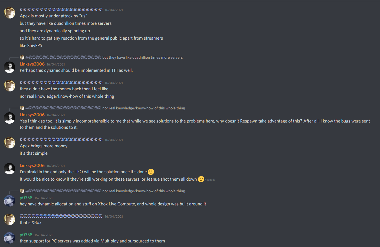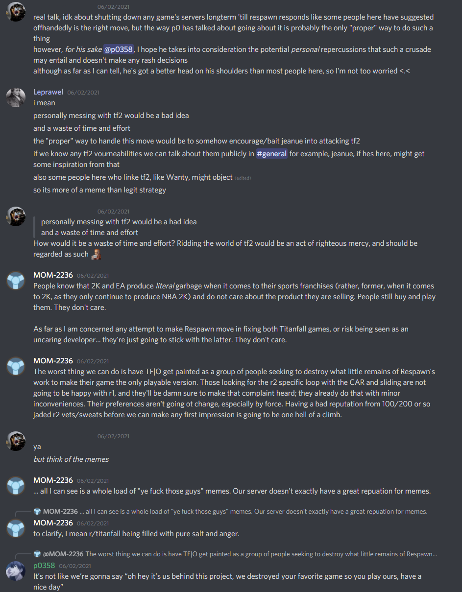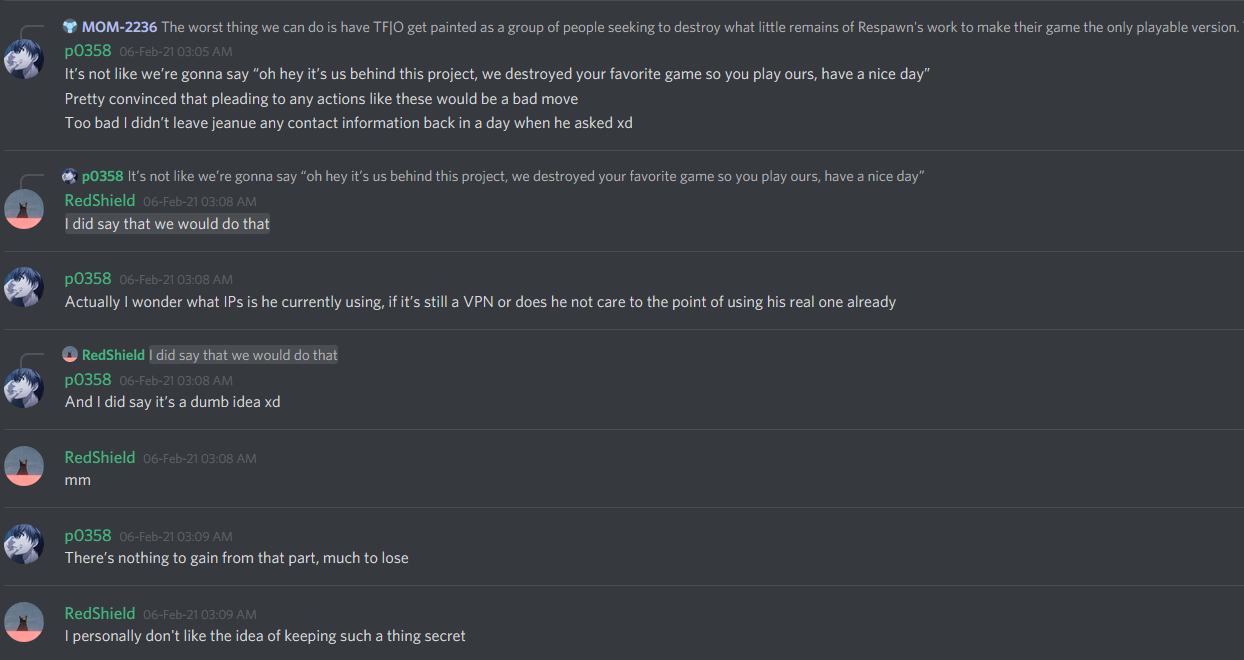 - Attacking the fully innocent revival project of TFO, which was started as a response to the attacks — trying to destroy the last chance for the community to be able to enjoy the game safe from any attacks thanks to the patches to its custom servers that we made and tested, a place where the attackers would be helpless, not reliant on Respawn's mercy to implement any fixes;