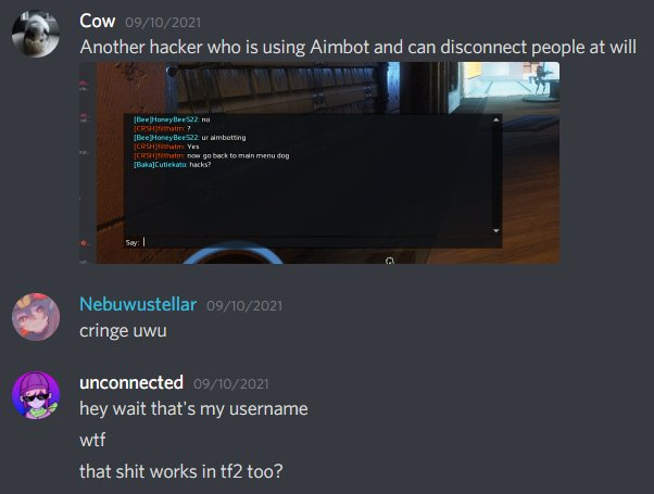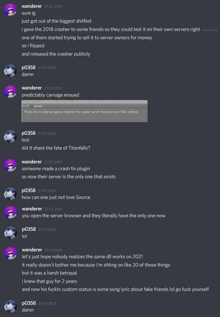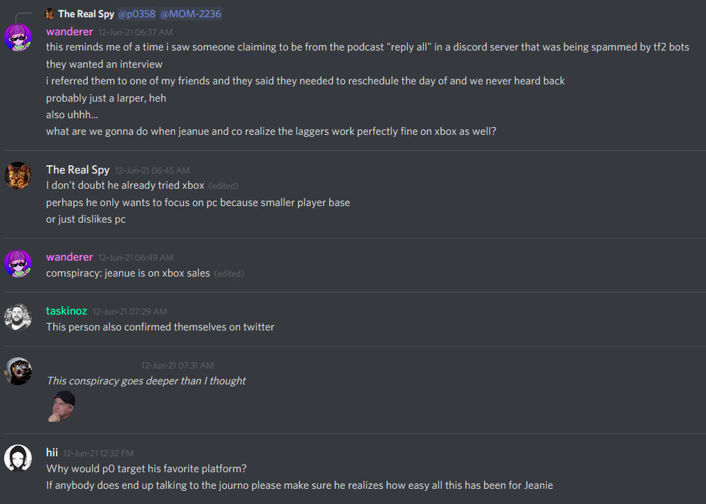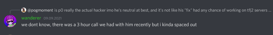 - wanderer (affiliated with RedTape authors) has been crashing TF2 games and impersonating p0358, similar to what Jeanue has done in the past. Very suspicious...