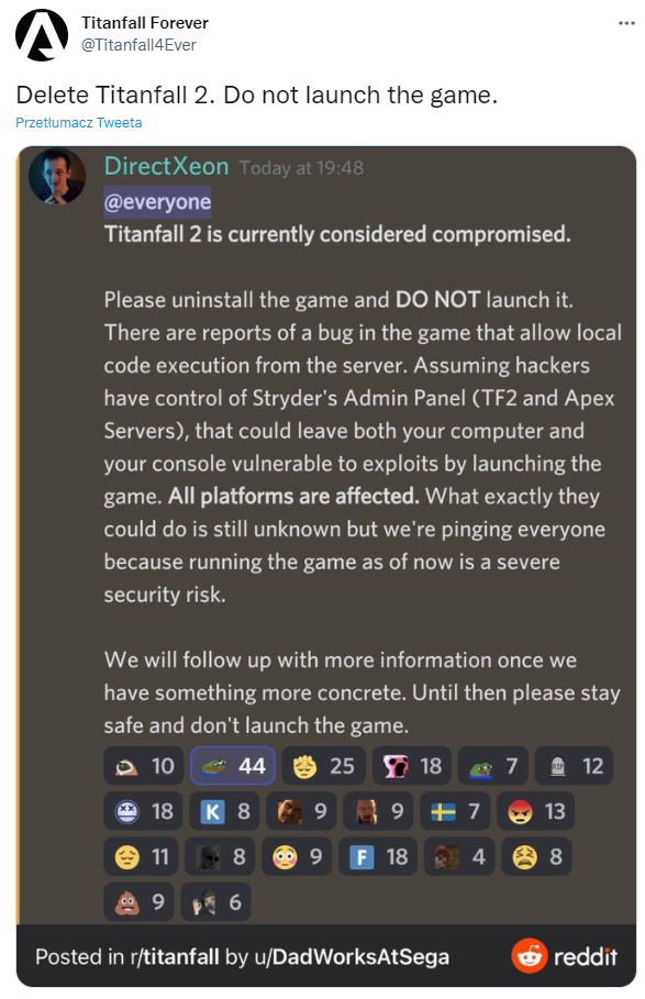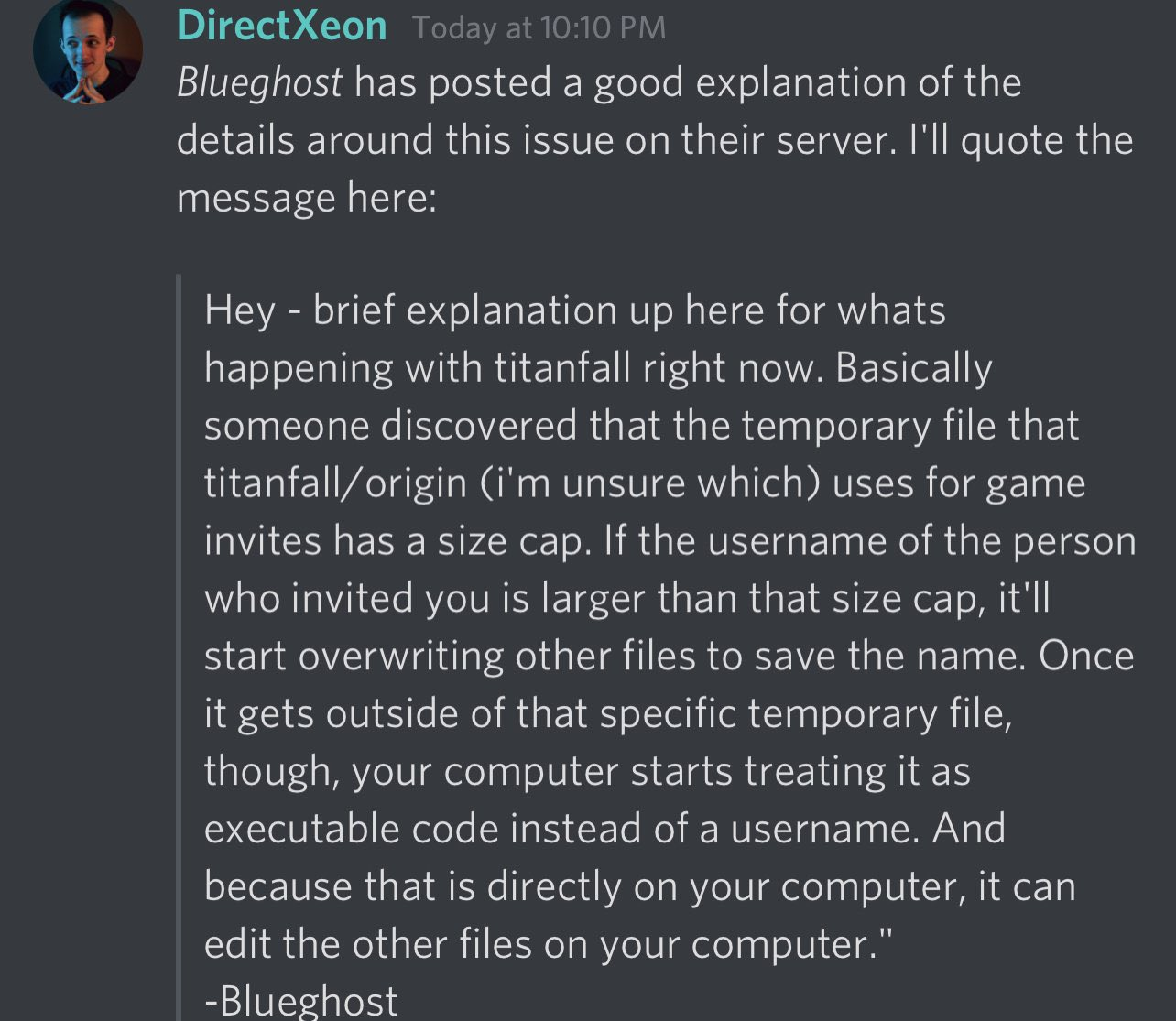 - Has issued a big over-exaggerated warning of a potential Remote Code Execution attack possibility in Titanfall 2 together with iiishiii, which ended up creating a lot of panic in the community.
