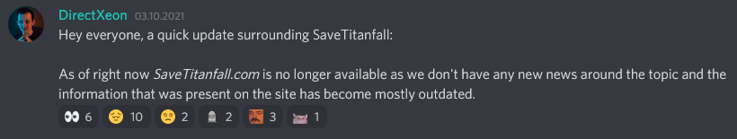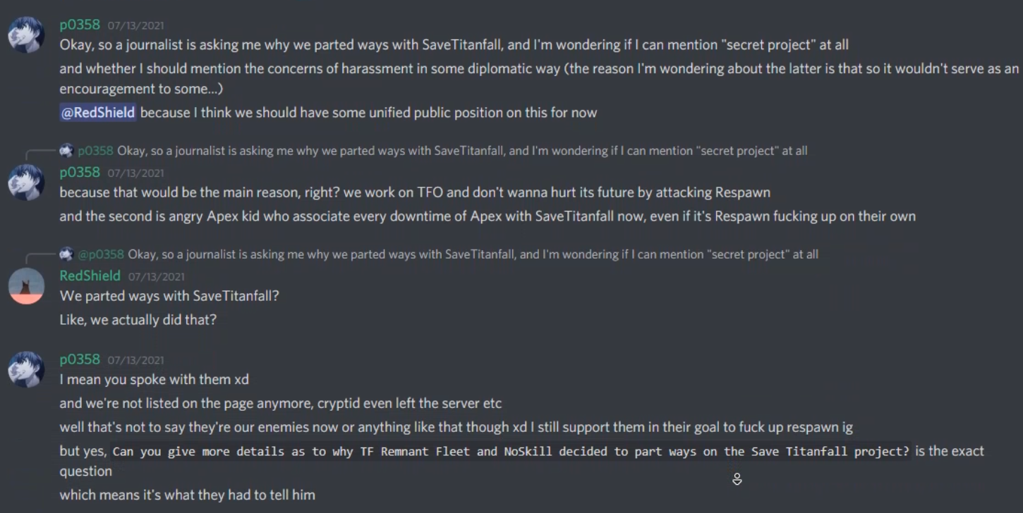 - (Now former) admin and co-creator of NoSkill, started the https://savetitanfall.com initiative and reached out to TF Remnant Fleet, which became the hub of the discussion, for help on website's content and on contacting content creators and news outlets to spread the word, before ways between NoSkill and Remnant Fleet parted with what we thought was a peaceful decision.