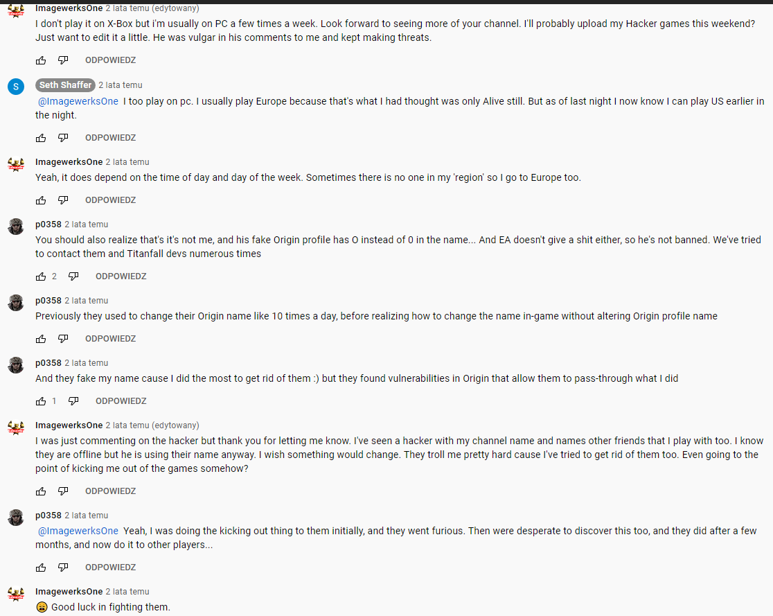Their prevalence on the servers was causing a lot of disruption for the tiny Titanfall 1 community. It was not possible to not encounter them somewhere on the servers, and playing against three cheaters at once barely made sense. Numerous complaints and reports of their accounts in every possible channel were left unanswered. It was weird, because in 2016 there was a clan of five Titanfall 1 cheaters who would record their gameplay to YouTube, whom ended up getting their Origin accounts banned. As such, the community could not understand the lack of reaction roughly a year or two later.