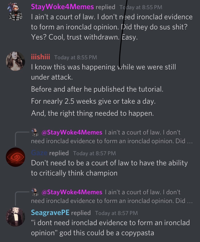 They explicitly warned some of us that some messages could be taken out of context and used maliciously against us, because that's exactly what they were doing. We're not sure what their motivation was, but these people cannot be trusted to provide any quality information. They did prove that they can destroy anyone if they want to, and people will just believe them.