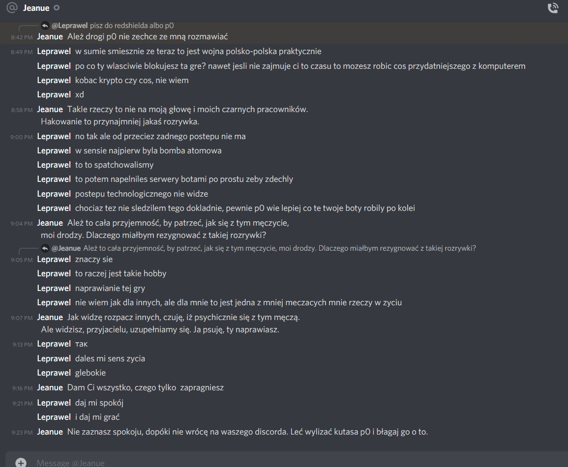 Unfortunately, while some random cheaters got the memo and either abandoned cheating or the entire game, the Jeanue and his friends turned out to be special. They did not give up. And seeing how much the game is broken, they begun to research vulnerabilities on their own and use anything they have found against all the players. And they did find more than even I had known, their day-long attacks rendering the game completely unplayable in 2019. Initially they would do this manually, switching up, using the fact that they are in three different timezones, later (most likely) developing macros to automate their actions, before ending up with bots.