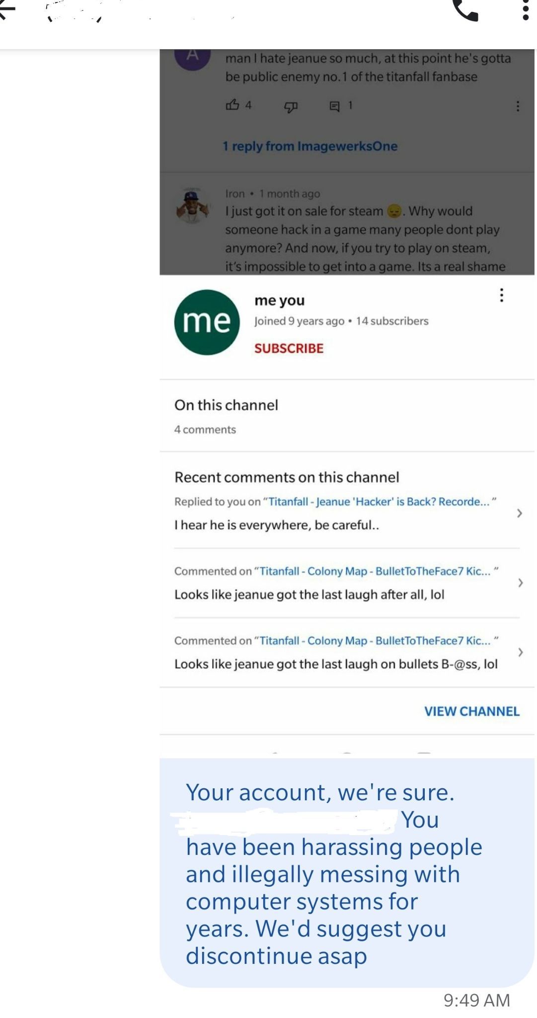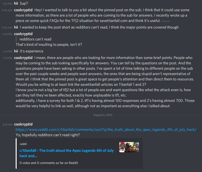 - Tried to establish savetitanfall.com as the authority on the attacks by pressuring an r/titanfall subreddit moderator into pinning his post to give it guaranteed visibility. After refusal, he got them removed from their moderator position out of revenge.