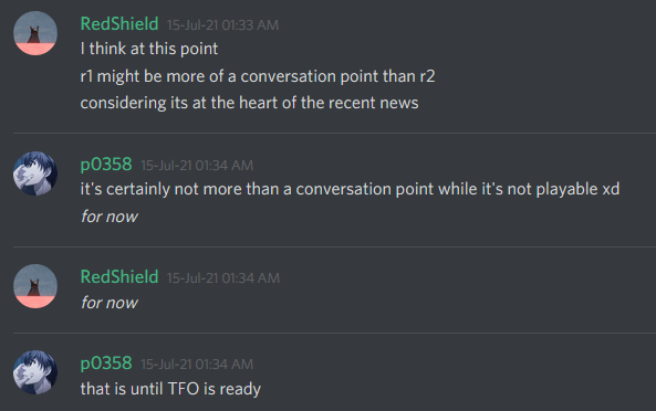 - while r1 is dead, spend hundreds/thousands of hours developing TFO to (maybe?) be able to make it a playable alternative to r1 with no plans for monetization, then…
